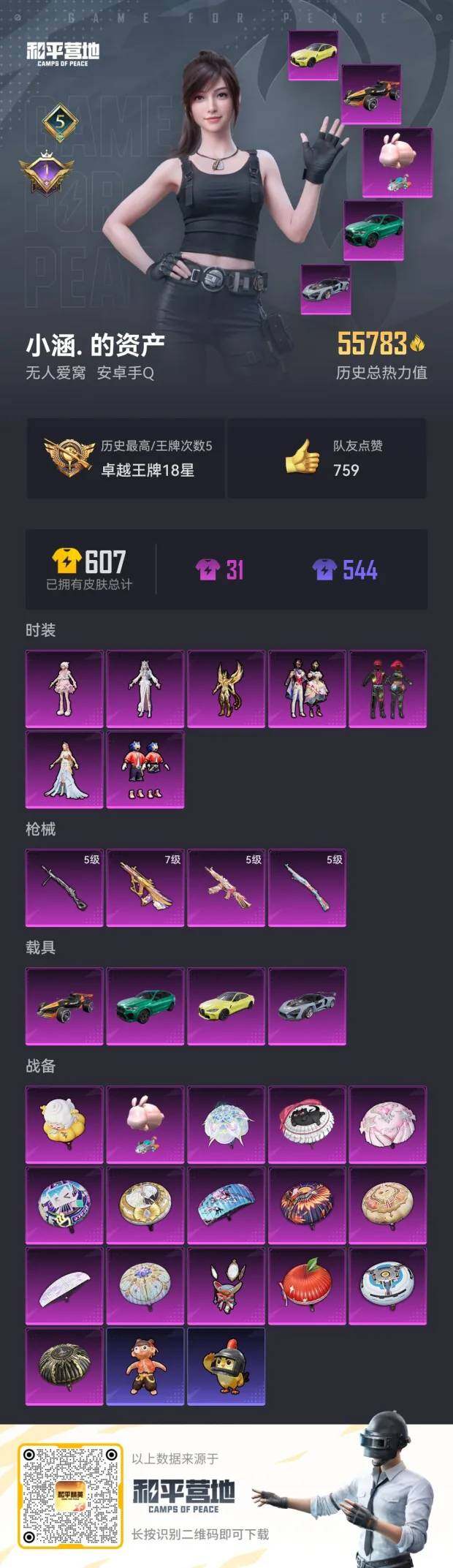 [13099303]安卓 手Q-7粉装-4特效枪-4载具-1粉色飞行器-55783热力值-5王牌印记-126套装-164枪皮