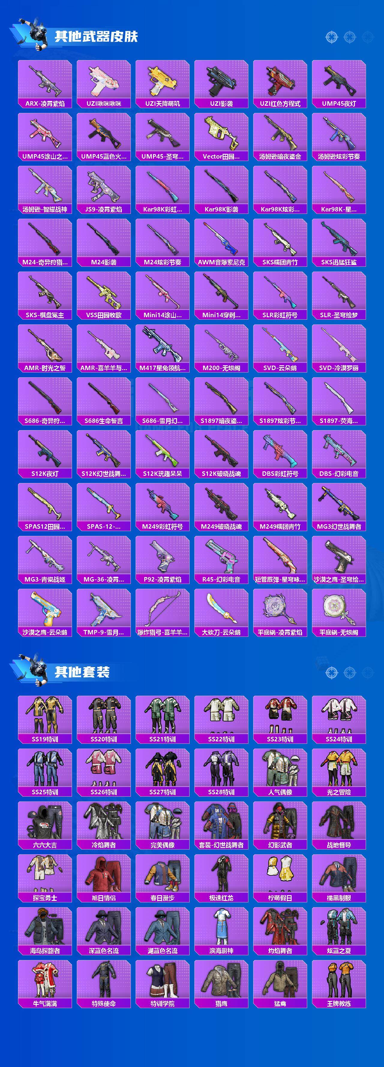 【稀有枪皮】:AKM-夜灯,AKM-彩虹符号,AKM-星兔领航员,AKM-灼热熔岩,M16A4-幻世战舞者,M16A4-蓝色火焰,SCAR-L-夜灯,SCAR-L-玉兔迎春,SCAR-L-红色方程式,M416-糯团青竹,M416-红色方程式,M416-绯红前夜,M416-蓝色火焰,GROZA-田园牧歌,AUG-耀粉歌者,QBZ-彩虹符号,M762-天降萌叽,M762-绯红前夜,M762-云朵鹅,G36C-星穹咏叹调,AC-VAL-天降萌叽,蜜獾-天降萌叽,蜜獾-绯穹魔姬,蜜獾-御兔特攻,ARX-凌霄紫焰,UZI-啾咪啾咪,UZI-天降萌叽,UZI-影袭,UZI-红色方程式,UMP45-夜灯,UMP45-涂山之恋,UMP45-蓝色火焰,UMP45-圣穹绘梦,Vector