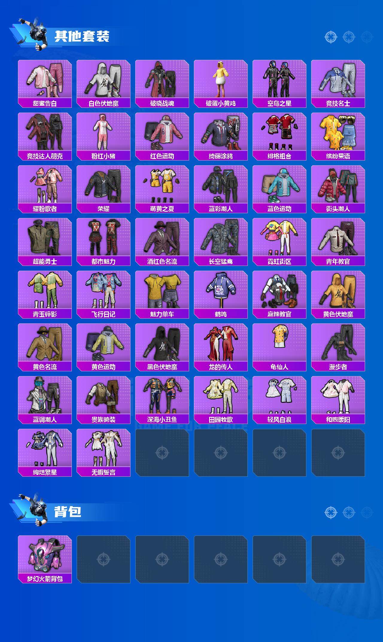 【粉色套装】:粉装-放客神游,粉装-音爆索尼克,角色-智耀战神,角色-凤凰座 一辉,粉装-星穹咏叹调,角色-冷漠罗丽,角色-羊梦糖心