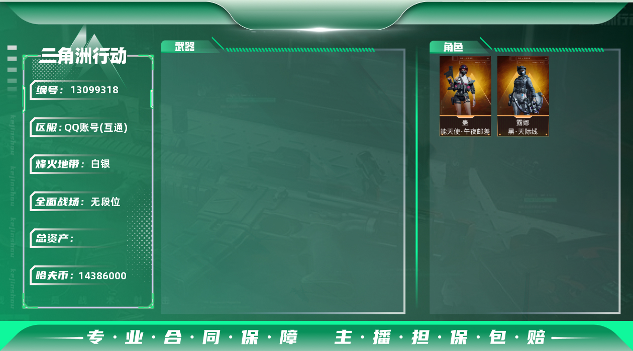 - [11608141]总资产:157.1M 10传说枪械 哈夫币:69.781K 进阶安全箱(9.17到期) 可二次 可修改实名 烽火地带段位:青铜 全面战场段位:列兵 传说武器皮肤:M4A1突击步枪-阿米娅,CAR-15突击步枪-阿米娅,复合弓-黑-天际线,AWM狙击步枪-捞点薯条,腾龙突击步枪-捞点薯条,93R-捞点薯条,AK-12突击步枪-特斯拉线圈,SR-3M紧凑突击步枪-特斯拉线圈,UZI冲锋枪-特斯拉线圈,勇士冲锋枪-能天使-午夜邮差 史诗武器皮肤:SV-98狙击步枪-林中猎手,SCAR-H战斗步枪-囚徒,S12K霰弹枪-曙光,M700狙击步枪-竞技风