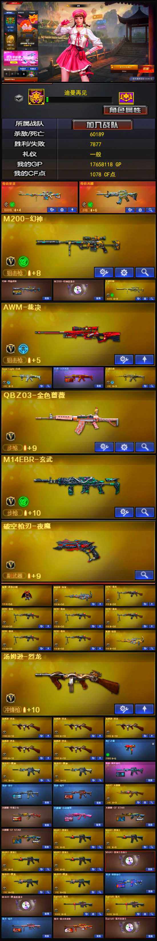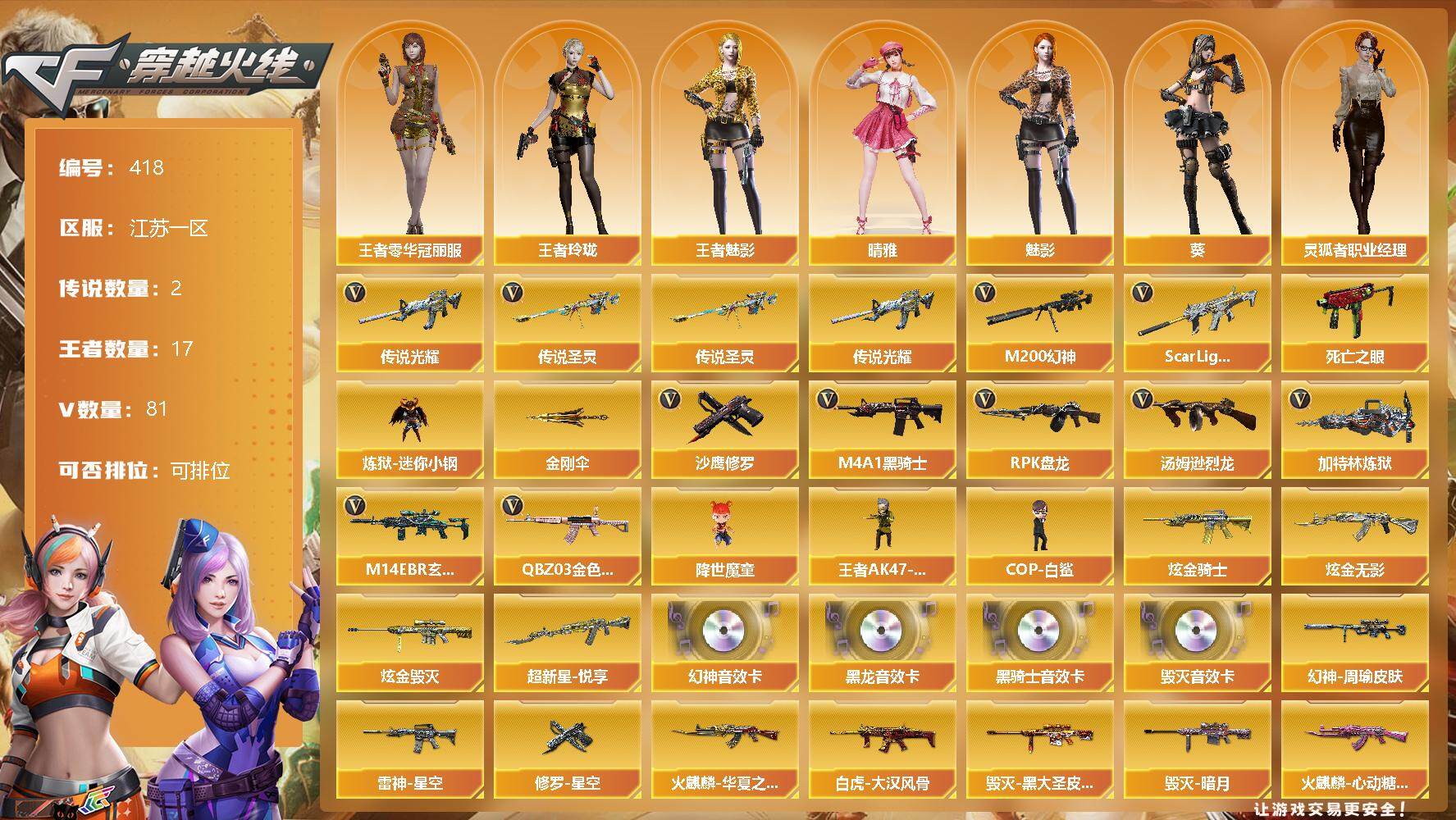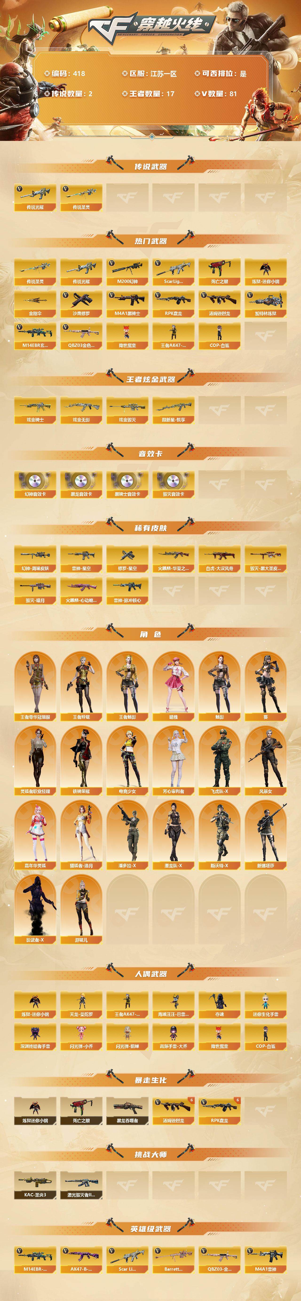[13099377]【418】78V/102级/荣耀元首/2传说/17王者/4炫金/3英雄/传说光耀/传说圣灵/QBZ03-金色蔷薇/M14EBR-玄武/Scar Light-白虎/M200-幻神/死亡之眼/炼狱-迷你小钢/M4A1-黑骑士/汤姆逊-烈龙/RPK-盘龙/加特林-炼狱/降世魔童/王者AK47-萌萌银发刀锋/COP-白鲨/沙鹰-修罗/金刚伞/超新星-悦享/炫金黑骑士/炫金无影/炫金毁灭/M200-幻神音效卡/M4A1-黑龙音效卡/M4A1-黑骑士音效卡/Barrett-毁灭音效卡/幻神周瑜/白虎-大汉风骨/雷神-暗月/雷神-星空/雷神-脉冲核心/火麒麟-雷神/火麒麟-华夏之心/火麒麟-心动糖果/毁灭-暗月/毁灭-黑大圣皮肤/黑龙-能量核心/天启-暗月/战神-粉色甜心皮肤/战神-紫绶金章皮肤/战神-流金岁月皮肤/AK47-B-常胜将军-曹操/AK47-B-常胜将军-刘备/极光-能量核心/修罗-能量核心/修罗-星空/葵/魅影/晴雅/王者-零-华冠丽服/王者玲珑/王者-魅影/电竞少女/芳心审判者/飞虎队-X/风暴女/嘉年华灵狐/猎狐者-追月/灵狐者-职业经理/曼陀罗-礼服/潘多拉-X/潜龙队-X/斯沃特-X/铁骑荣耀/新娜塔莎/影武者-X/游珑儿/天龙-曼陀罗/海滩汪汪-巴雷特/夺魂/迷你生化手雷/深渊终结者手雷/闪光弹-小乔/闪光弹-貂蝉/高爆手雷-大乔/黑龙吞噬者/6烈龙/6盘龙/激光毁灭者III-白马银枪/KAC-圣炎切割者/AK47-火麒麟/M4A1-黑龙/M4A1-雷神/M4A1-死神/AK47-黑武士/AK12-天启/M4A1-武圣/M4A1-龙血/无影-神兵利器/AK47-黑武士-锦绣游龙/M4A1-玫瑰精灵/M4A1-猎神/王者之心-觉醒版/王者之魄-觉醒版/王者之圣-觉醒版/AK-47-猩红传说/AK47-B-战神/王者之城-觉醒版/AK47-B-常胜将军/王者白虎-觉醒版/黑武士-CF网剧冠军/AWM-天龙/Barrett-毁灭/Barrett-极光/AWM-裁决/Barrett-金色蔷薇/王者幻神-觉醒版/Barrett-雷霆王者-觉醒版/炼狱-悦蓝-觉醒版/AA-12-雷霆/沙鹰-天神/破空枪刃-夜魔/天神-CF网剧冠军/王者之灵-觉醒版/屠龙/龙啸/马来剑夜魔/擎天/麒麟刺/幻灵之锋/擎天-CF网剧冠军/王者之锋-觉醒版/王者之击-觉醒版/高爆手雷-夜