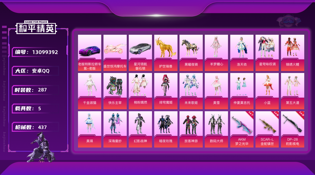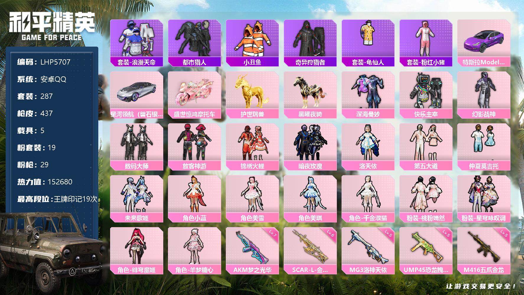 [13099392]素材身法号 安卓 手Q-19粉装-29特效枪-5载具-11粉色飞行器-15.2w热力值-19王牌印记-287套装-437枪皮【热门品类】:套装-浪漫天命,套装-都市猎人,套装-小丑鱼,套装-奇异狩猎者,套装-龟仙人,套装-粉红小猪【粉色载具】:特斯拉Model 3(奇幻紫),星河领航(磐石银),盛世惊鸿摩托车,护世瑞兽,黑曜夜骑【粉色套装】:粉装-深海曼妙,粉装-快乐主宰,粉装-幻影战神,粉装-数码大师,粉装-放客神游,粉装-锦绣火鲤,粉装-暗夜玫瑰,角色-洛天依,粉装-第五大道,粉装-仲夏莫吉托,粉装-未来歌姬,角色-小蓝,角色-美雪,角色-美琪,角色-千金淑猫,粉装-桃粉嫣然,粉装-星穹咏叹调,角色-绯穹魔姬,角色-羊梦糖心【粉色枪皮等级】:AKM-炫紫旋律(一级),AKM-梦之光华(七级),SCAR-L-锦绣绵绵(五级),SCAR-L-金蛇镇世(六级),M416-五爪金龙(五级),M416-电玩时刻(五级),M416-灵猫魔法师(三级),GROZA-旋转彩虹(一级),GROZA-巴啦啦小魔仙(五级),AUG-暖羊咩咩(五级),M762-电糖天使(五级),UMP45-恐龙拽拽(五级),Vector-绯穹魔姬(四级),汤姆逊-热量炸弹(五级),AKS-74U-星穹咏叹调(四级),P90-沙丘之主(三级),Kar98K-巳巳如意(五级),Kar98K-圣域龙灵(三级),Mk14-甜梦熊击(五级),AMR-鸢尾晶梦(四级),M417-第五大道(二级),DP-28-千金淑猫(三级),DP-28-豹影疾电(五级),MG3-洛神天依(五级),MG3-梦幻舞会(一级),PKM-江南烟雨(二级),MG-36-沧焰双生(四级),平底锅-喜羊羊与灰太狼(二级),烟雾弹-丁香清露(四级)【粉色枪皮】:AKM-炫紫旋律,AKM-梦之光华,SCAR-L-锦绣绵绵,SCAR-L-金蛇镇世,M416-五爪金龙,M416-电玩时刻,M416-灵猫魔法师,GROZA-旋转彩虹,GROZA-巴啦啦小魔仙,AUG-暖羊咩咩,M762-电糖天使,UMP45-恐龙拽拽,Vector-绯穹魔姬,汤姆逊-热量炸弹,AKS-74U-星穹咏叹调,P90-沙丘之主,Kar98K-巳巳如意,Kar98K-圣域龙灵,Mk14-甜梦熊击,AMR-鸢尾晶梦,M417-第五大道,DP-28-千金淑猫,DP-28-豹影疾电