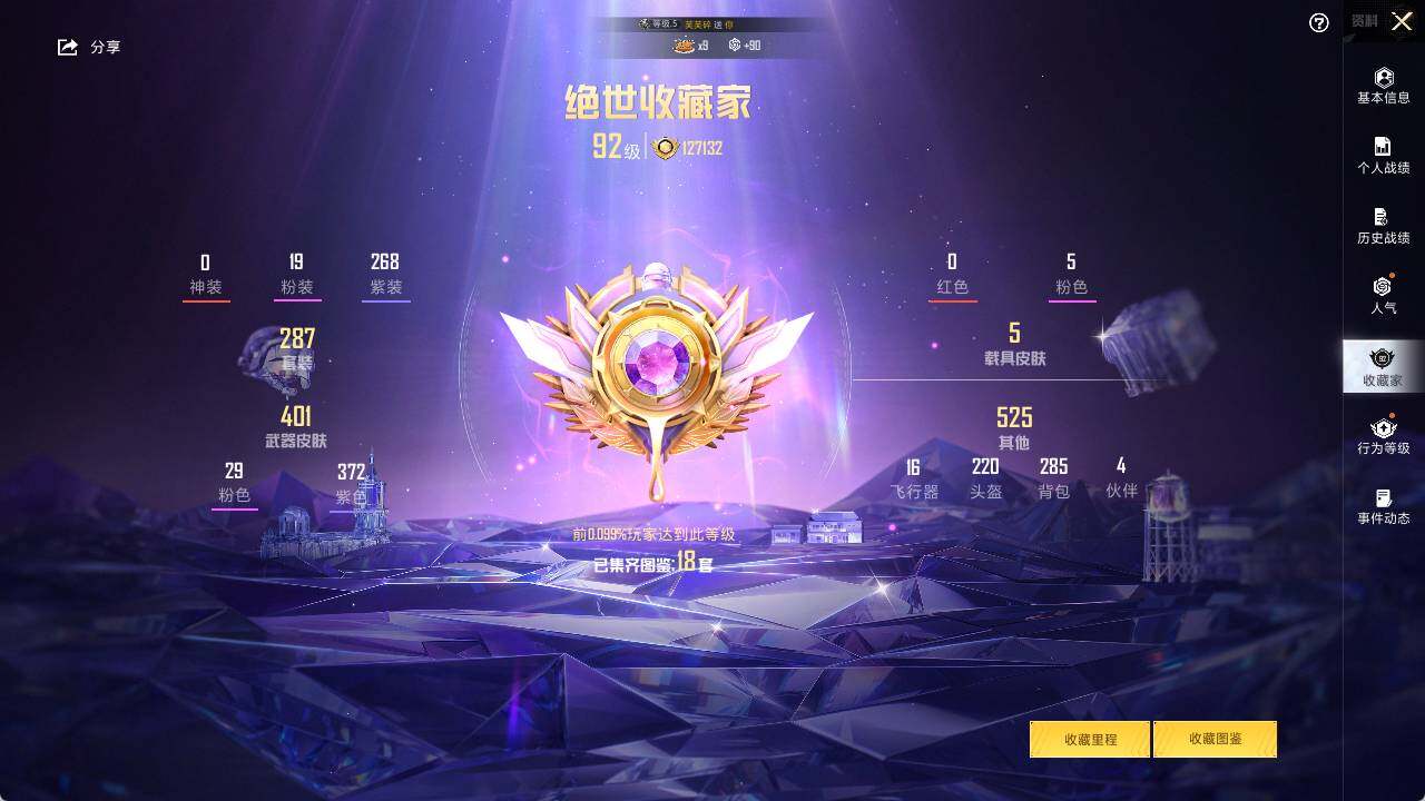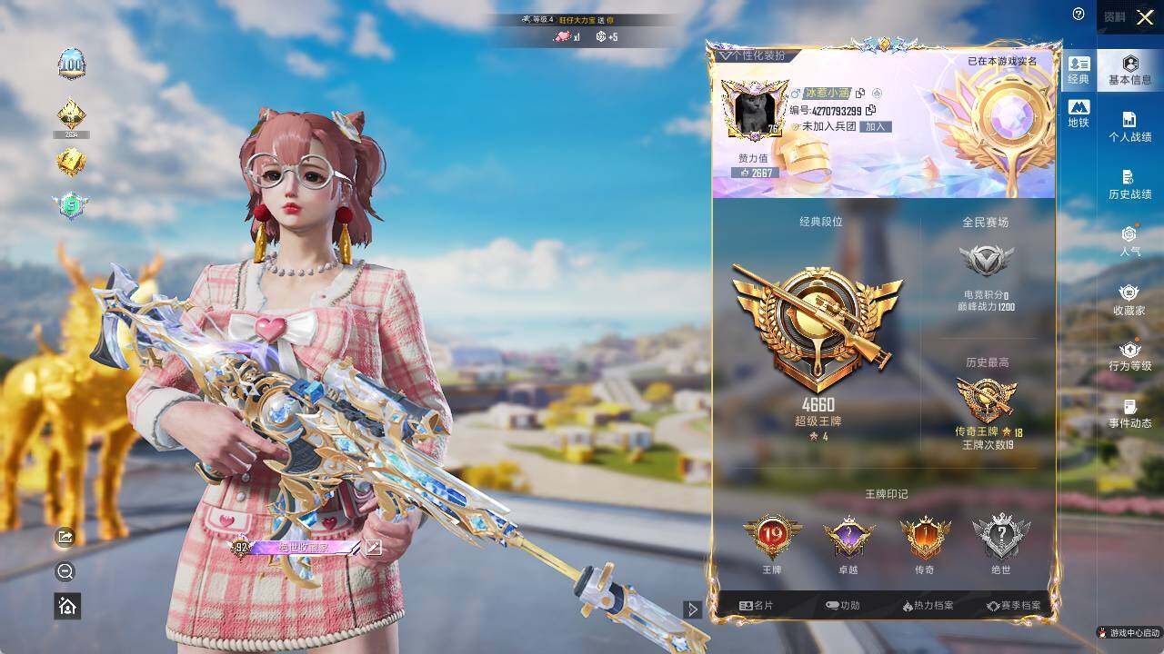 - 苹果QQ 可二次 当前段位荣耀皇冠Ⅳ 历史最高段位绝世王牌19星 热力值98303 等级68 套装180 王牌次数10 点券15 外观套装11 枪械皮肤13 热门紫装16 载具2 飞行器4 稀有0 头盔0 背包1