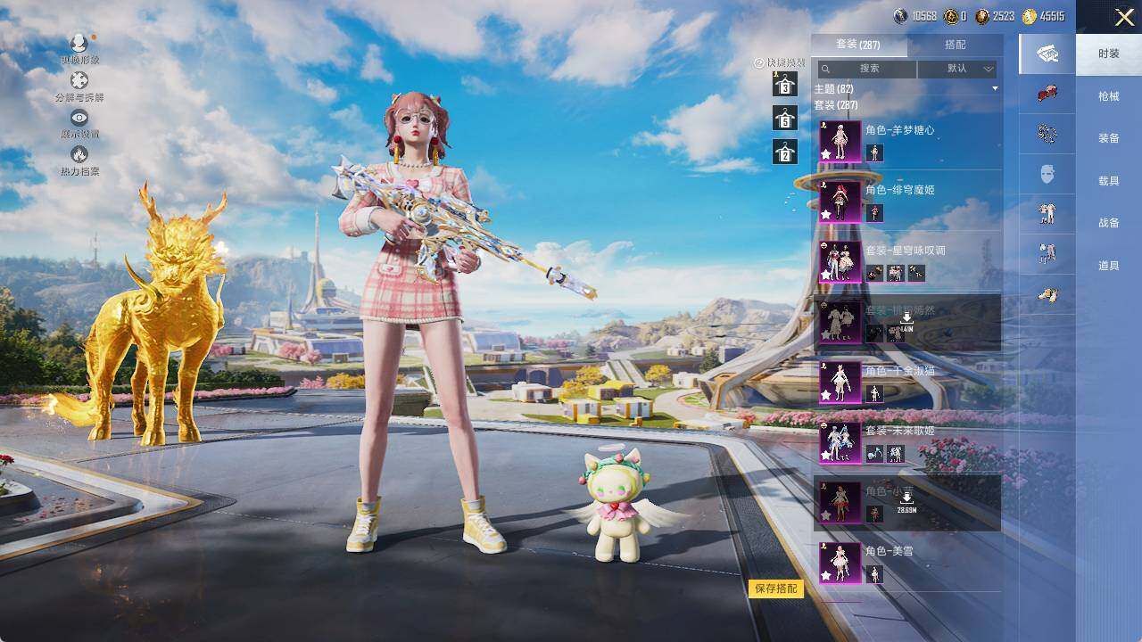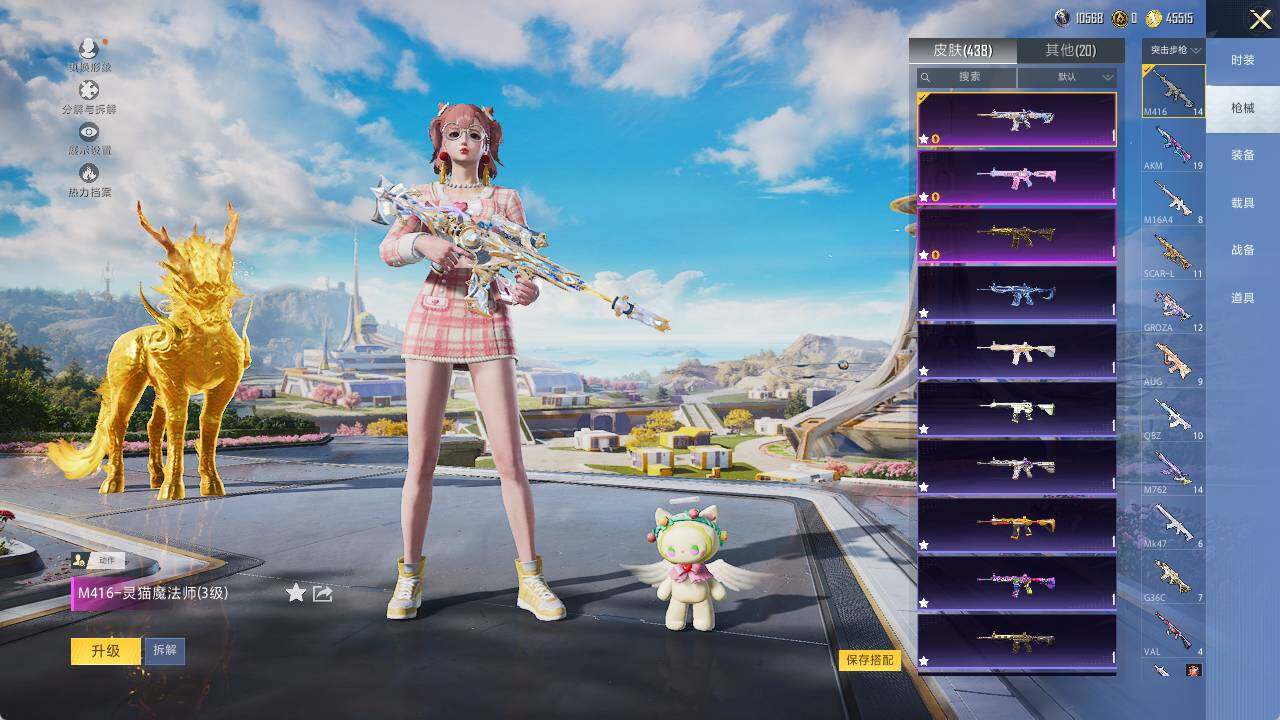 AKM-炫紫旋律,AKM-梦之光华,SCAR-L-金蛇镇世,M416-五爪金龙,M416-电玩时刻,GROZA-旋转彩虹,GROZA-巴啦啦小魔仙,AUG-暖羊咩咩,M762-电糖天使,UMP45-恐龙拽拽,P90-沙丘之主,Kar98K-巳巳如意,Kar98K-圣域龙灵,AMR-鸢尾晶梦,M417-第五大道,DP-28-千金淑猫,MG3-洛神天依,MG3-梦幻舞会,PKM-江南烟雨,烟雾弹-丁香清露