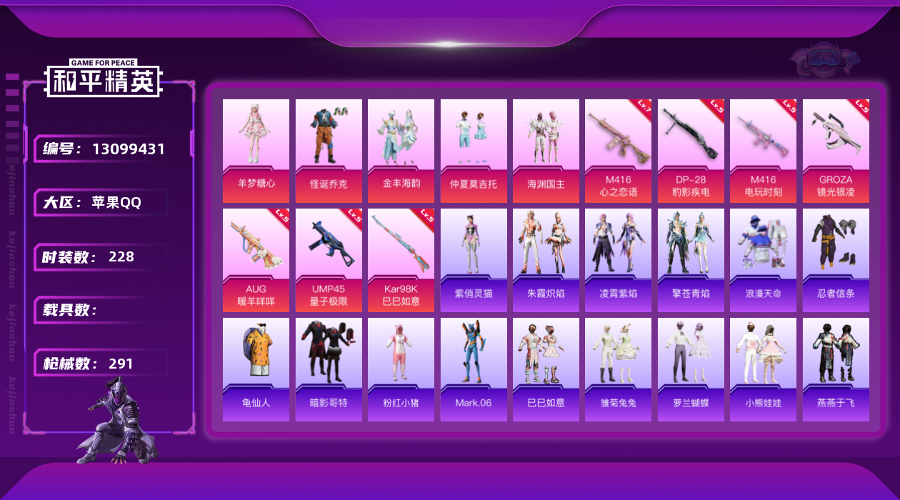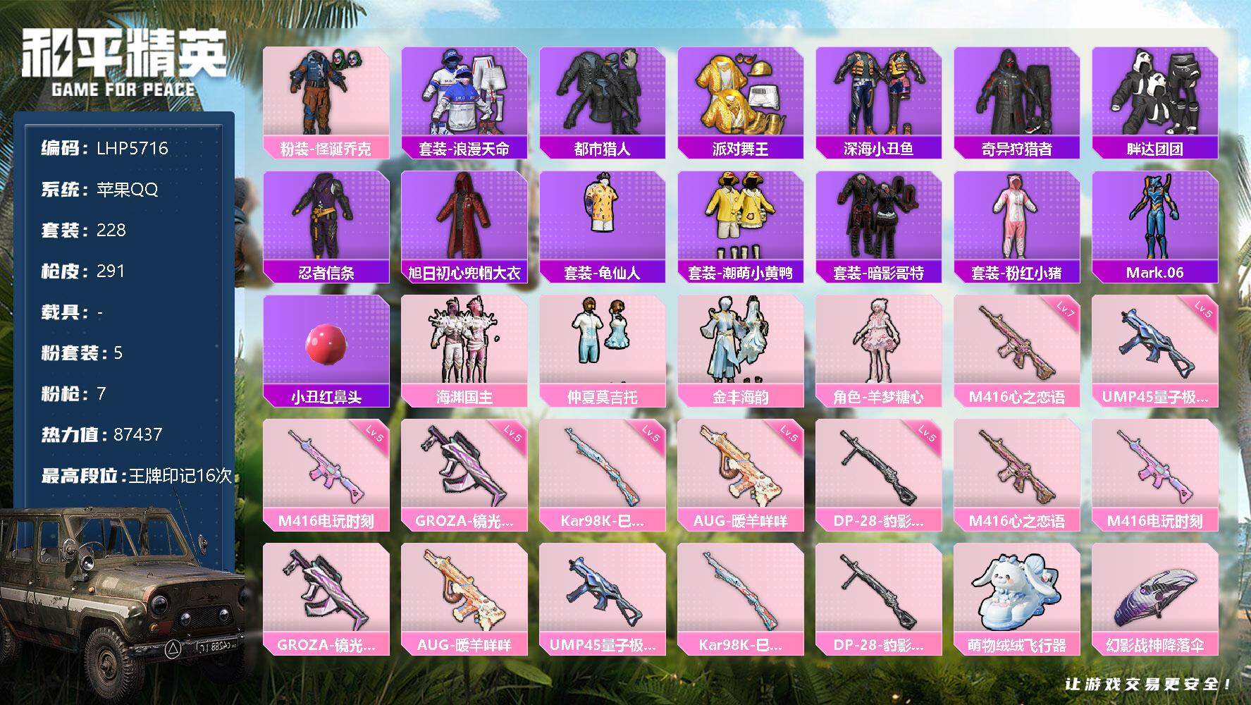 [13099431]素材身法号/地铁满天赋 苹果 手Q-5粉装-7特效枪-1粉色飞行器-8.7w热力值-16王牌印记-228套装-291枪皮【热门品类】:粉装-怪诞乔克,套装-浪漫天命,套装-都市猎人,套装-派对舞王,套装-深海小丑鱼,套装-奇异狩猎者,套装-胖达团团,套装-忍者信条,旭日初心兜帽大衣,套装-龟仙人,套装-潮萌小黄鸭,套装-暗影哥特,套装-粉红小猪,角色-Mark.06,小丑红鼻头【粉色套装】:粉装-怪诞乔克,粉装-海渊国主,粉装-仲夏莫吉托,粉装-金丰海韵,角色-羊梦糖心【粉色枪皮等级】:M416-心之恋语(七级),M416-电玩时刻(五级),GROZA-镜光银凌(五级),AUG-暖羊咩咩(五级),UMP45-量子极限(五级),Kar98K-巳巳如意(五级),DP-28-豹影疾电(五级)【粉色飞行器】:萌物绒绒飞行器
