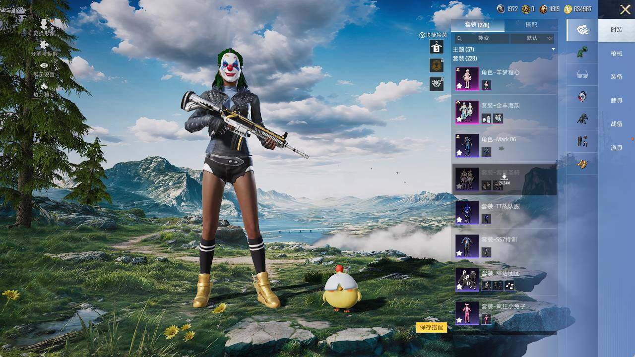 套装-浪漫天命,忍者信条套装,套装-龟仙人,套装-暗影哥特,套装-粉红小猪,角色-Mark.06,套装-极速红龙,套装-狂沙舞者,套装-破蛋小黄鸡,套装-漫步者,套装-西部牛仔,套装-雪山精英,套装-黑色刀锋,海洋之心套装,套装-瑞龙福将,套装-团圆交子