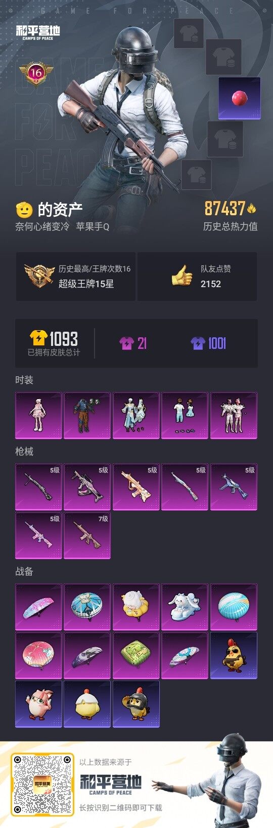 - PX_2081126-时装数: 537 枪械数: 187 战备数: 144 热门装扮: 太空嘟嘟,奶芙汪汪,飒粉甜心,闲梦青缨,蜜语绒猫,烟云彩露,电磁星,星穹咏叹调 稀有枪皮: SCAR-L-锦绣绵绵【5级】,SPAS-12蜜语绒猫【7级】,Kar98K-巳巳如意【5级】
