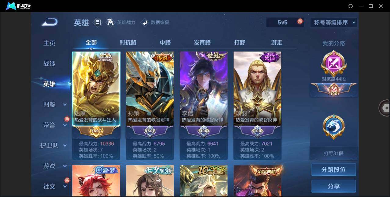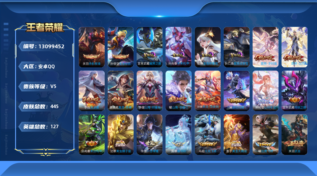 [13099452]对抗路44段/打野31段,安卓Q-V5-最强王者段位-127英雄-445皮肤-2典藏-43传说-139史诗