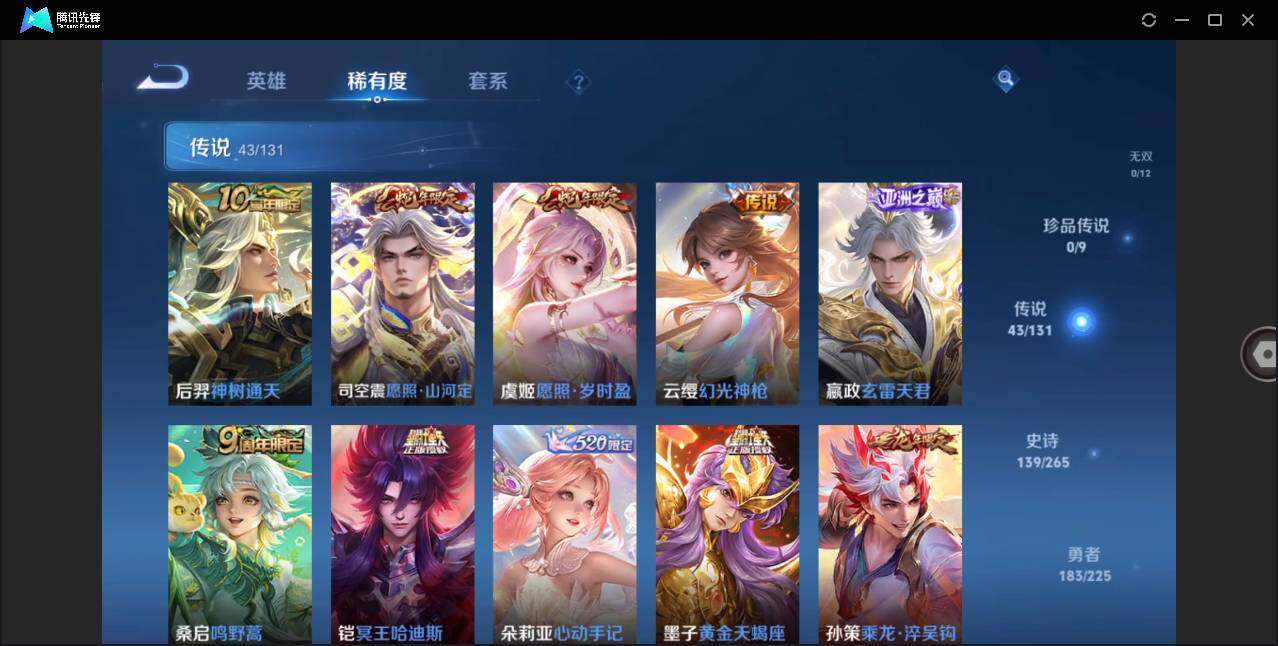 - [12090395]V7 12传说 125英雄 219皮肤 可修改实名 优质装备:云鹰飞将(小将军),炽阳神光,一念神魔,末日机甲-孙尚香(绿蚂蚱),超时空战士-狄仁杰,无双飞将,燃星之曲,记忆之芯(机甲兔),妄想实况,澜逐花归海 传说皮:祥瑞亨通 珍宝阁皮:胡桃夹子,蔷薇恋人 限定皮:逐霄战戟,至尊宝,异界灵契(白毛香),飞衡(韩信年限),遇见飞天,五谷丰年,冰锋战神,李小龙,大圣娶亲 史诗皮:化蝶舞,星界战将,谪仙醉月,石田雨龙,琥珀纪元伽罗,百相守梦-百里守约,星界特工,百相守梦-黄忠,黄金分割率,特工魅影,千年之狐,蒙恬荣光圣徽,偶像歌手,猫狗日记-孙策,乱世虎臣,节奏热浪,修罗,摇滚巨星,水果甜心,德古拉伯爵,暗隐猎兽者,鬼剑武藏,天秀·启明,纤云弄巧,乘风破浪,月团寄思,水晶猎龙者,唤灵魅影,金属风暴,原初追逐者,圣诞狂欢,鹰眼统帅,魅力维加斯,黎明之约,赏金猎手,无心,未来纪元-赵云