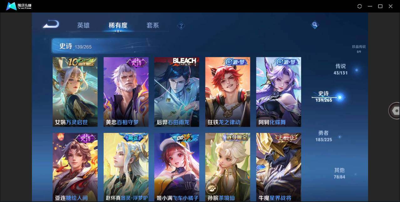 - [12194047]V9 3典藏 24传说 124英雄 304皮肤 可修改实名 优质装备:无限飓风号(高达),鸣剑·曳影,全息碎影(猴子典藏),黄金狮子座,云鹰飞将(小将军),猫影幻舞,久胜战神,炽阳神光,一念神魔,云霓雀翎,末日机甲-孙尚香(绿蚂蚱),地狱火,地狱之眼,音你心动-周瑜,李逍遥,淬星耀世,超时空战士-狄仁杰,涂山容容 珍宝阁皮:优雅恋人,蔷薇恋人,女武神 限定皮:至尊宝,白虎志(电光耗子),凤求凰(白切鸡),太华(伽罗年限),梅西,武陵仙君(小桃花),傲雪梅枪,魔法小厨娘,时雨天司(水龙头),神威(电光马子),飞衡(韩信年限),遇见飞天,高山流水,五谷丰年,青龙志(铠年限),冰锋战神,武圣,梁祝,御风骁将(吕布年限),天狼狩猎者,龙胆,逐梦之星,天狼溯光者,虎魄,天狼征服者,李小龙,逐梦之影,逐梦之光,朱雀志(守约年限),永曜之星,辉光之辰,如梦令-后羿,霸王别姬-虞姬,默契交锋-兰陵王,猪悟能,大圣娶亲,引擎之心,天魔缭乱,冰霜恋舞曲,蜜橘之夏,山海·玄木吟(马可年限) 史诗皮:紫霞仙子,苍穹之光,电玩小子(小书包),黄金分割率,千年之狐,魅语,无限星赏官,冰冠公主,偶像歌手,晚萤,龙骑士(小龙虾),末日机甲-吕布,猫狗日记-孙策,时之恋人-孙尚香,乱世虎臣,节奏热浪,修罗,女仆咖啡,摇滚巨星,水果甜心,绅士熊喵,天才门将,星夜王子,心灵骇客,功夫厨神,德古拉伯爵,暗隐猎兽者,幽灵船长,鬼剑武藏,暗渊魔法,心灵战警,舞动绿茵,地狱岩魂,纤云弄巧,繁星吟游(呼啦呼啦),缤纷独角兽,乘风破浪,逐浪之夏,水晶猎龙者,曙光守护者,箭羽风息,金属风暴,原初追逐者,圣诞狂欢,圣诞恋歌,鹰眼统帅,黎明之约,赏金猎手,无心,未来纪元-赵云