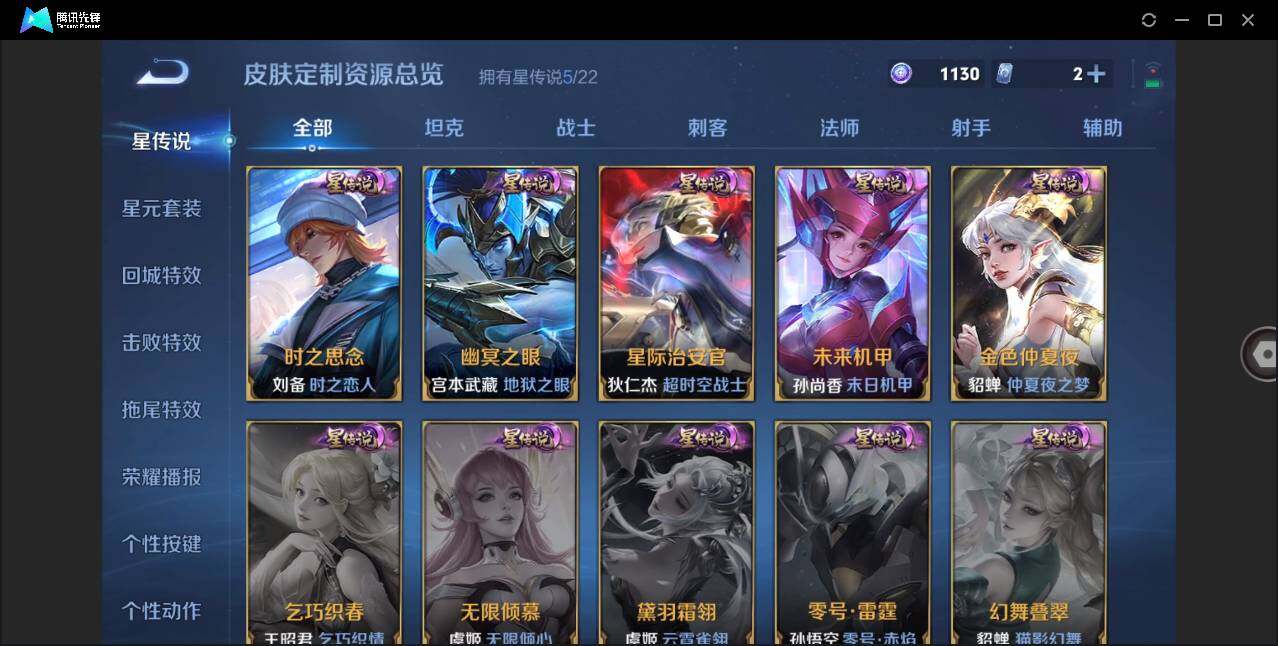 【传说皮肤】:后羿神树通天,司空震愿照山河定,虞姬愿照岁时盈,云缨幻光神枪,嬴政玄雷天君,桑启鸣野蒿,铠冥王哈迪斯,朵莉亚心动手记,墨子黄金天蝎座,孙策乘龙淬吴钩,澜逐花归海,露娜霜月吟,马可波罗妄想实况,伽罗炽翼辉光,孙悟空齐天大圣,曜山海苍雷引,李信山海炽霜斩,吕布怒海麟威,马超无双飞将,孙策挚爱之约,孙策末日机甲,裴擒虎寅虎赤拳,赵云淬星耀世,王昭君乞巧织情,周瑜音你心动,小乔音你心动,虞姬启明星使,关羽武圣,曜云鹰飞将,李信一念神魔,刘备时之恋人,张良黄金白羊座,干将莫邪久胜战神,虞姬云霓雀翎,达摩黄金狮子座,花木兰冠军飞将,梦奇胖达荣荣,貂蝉仲夏夜之梦,李白凤求凰,孙尚香末日机甲,宫本武藏地狱之眼,孙悟空地狱火,狄仁杰超时空战士
