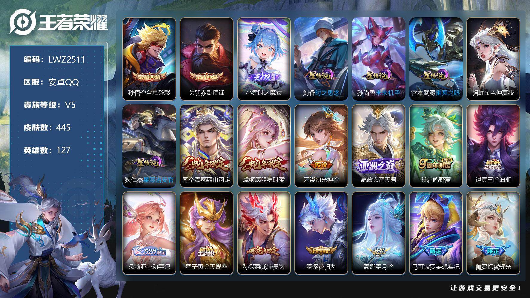 [13099452]对抗路44段/打野31段,安卓Q-V5-最强王者段位-127英雄-445皮肤-2典藏-43传说-139史诗 【英雄全皮】:廉颇全皮,嬴政全皮,阿轲全皮,达摩全皮,钟馗全皮,太乙真人全皮,狂铁全皮,李信全皮,猪八戒全皮,蒙恬全皮,司空震全皮,赵怀真全皮,戈娅全皮,影全皮,海诺全皮 【荣耀典藏】:孙悟空全息碎影,关羽赤影疾锋 【传说皮肤】:后羿神树通天,司空震愿照山河定,虞姬愿照岁时盈,云缨幻光神枪,嬴政玄雷天君,桑启鸣野蒿,铠冥王哈迪斯,朵莉亚心动手记,墨子黄金天蝎座,孙策乘龙淬吴钩,澜逐花归海,露娜霜月吟,马可波罗妄想实况,伽罗炽翼辉光,孙悟空齐天大圣,曜山海苍雷引,李信山海炽霜斩,吕布怒海麟威,马超无双飞将,孙策挚爱之约,孙策末日机甲,裴擒虎寅虎赤拳,赵云淬星耀世,王昭君乞巧织情,周瑜音你心动,小乔音你心动,虞姬启明星使,关羽武圣,曜云鹰飞将,李信一念神魔,刘备时之恋人,张良黄金白羊座,干将莫邪久胜战神,虞姬云霓雀翎,达摩黄金狮子座,花木兰冠军飞将,梦奇胖达荣荣,貂蝉仲夏夜之梦,李白凤求凰,孙尚香末日机甲,宫本武藏地狱之眼,孙悟空地狱火,狄仁杰超时空战士 【限定皮肤】:白起狰,铠冥王哈迪斯,暃埋骨钱,蒙犽顽岩魄,蔡文姬夏日便利店,大乔绒语心约,虞姬夏日便利店,姜子牙天穹之誓,杨戬破阵退雄兵,狄仁杰阴阳师,廉颇寅虎御盾,赵云皇家上将,赵云引擎之心,墨子神迹守卫,妲己时之奇旅,嬴政优雅恋人,嬴政白昼王子,孙尚香蔷薇恋人,鲁班七号狮舞东方,庄周高山流水,高渐离死亡摇滚,阿轲迷踪丽影,钟无艳超时空战士,扁鹊奇幻香踪,白起夜都怪侠,芈月重明,芈月幻夜卜梦,吕布猎兽之王,周瑜赤莲之焰,元歌云间偶戏,元歌无心,夏侯惇朔风刀,甄姬落雪兰心,曹操烛龙,典韦穷奇,典韦岱宗,马可波罗暗影游猎,马可波罗山海玄木吟,马可波罗妄想实况,狄仁杰魔术师,狄仁杰万华元夜,达摩星际陆战队,达摩沙漠行僧,项羽海滩派对,老夫子醍醐杖,老夫子航海奇遇记,关羽武圣,安琪拉魔法小厨娘,程咬金演武夺筹,韩信飞衡,韩信傲雪梅枪,王昭君午后时光,兰陵王金庭之子,花木兰青春决赛季,花木兰默契交锋,亚瑟潮玩骑士王,孙悟空孙行者,孙悟空齐天大圣,牛魔御旌,后羿如梦令,后羿圣弓游侠,李元芳银河之约,李元芳匿光侦查者,李元芳云中旅人,虞姬启明星使,钟馗神迹守卫,钟馗驱傩正仪,杨玉环寅虎心曲,杨戬潮玩骑兵,干将莫邪真爱魔法,