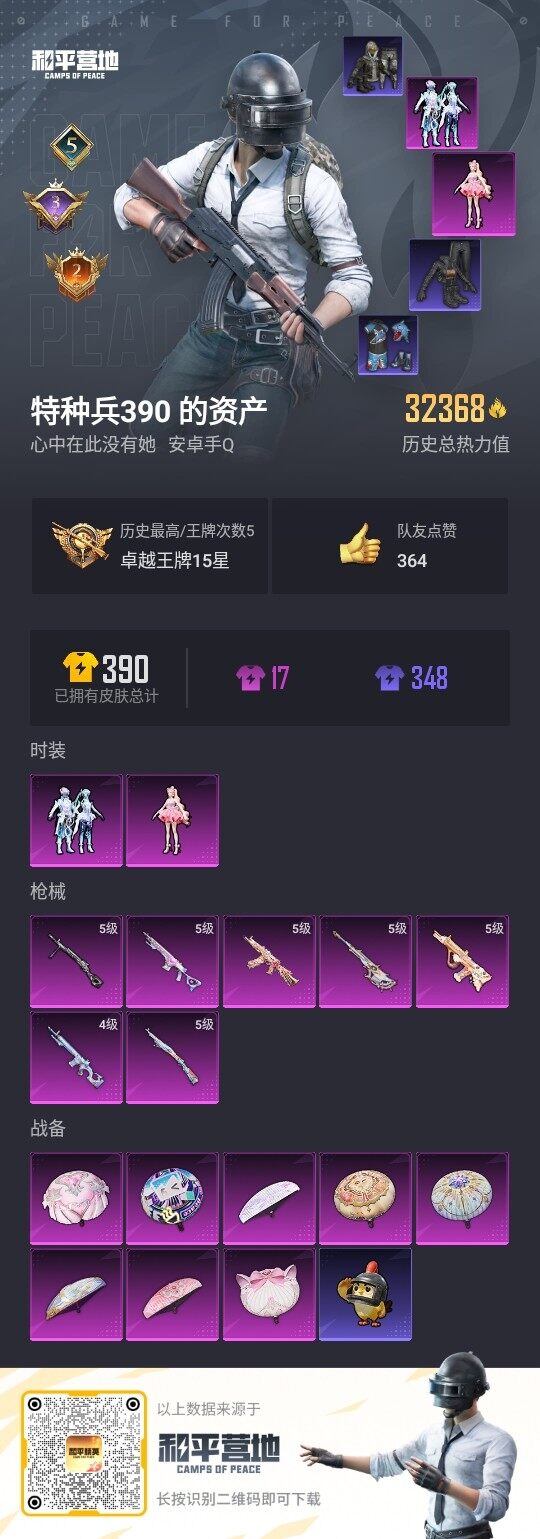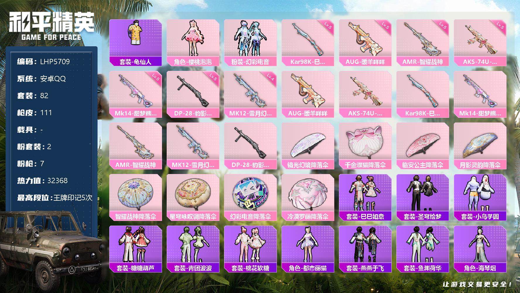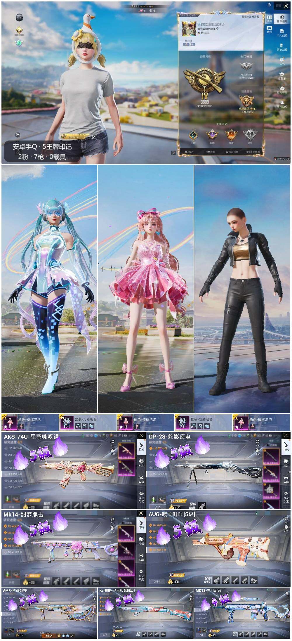 [13099534]地铁满天赋 安卓 手Q-2粉装-7特效枪-3.2w热力值-5王牌印记-82套装-111枪皮【热门品类】:套装-龟仙人【粉色套装】:角色-樱桃泡泡,粉装-幻彩电音【粉色枪皮等级】:AUG-暖羊咩咩(五级),AKS-74U-星穹咏叹调(五级),Kar98K-巳巳如意(五级),Mk14-甜梦熊击(五级),AMR-智耀战神(五级),MK12-雪月幻音(四级),DP-28-豹影疾电(五级)