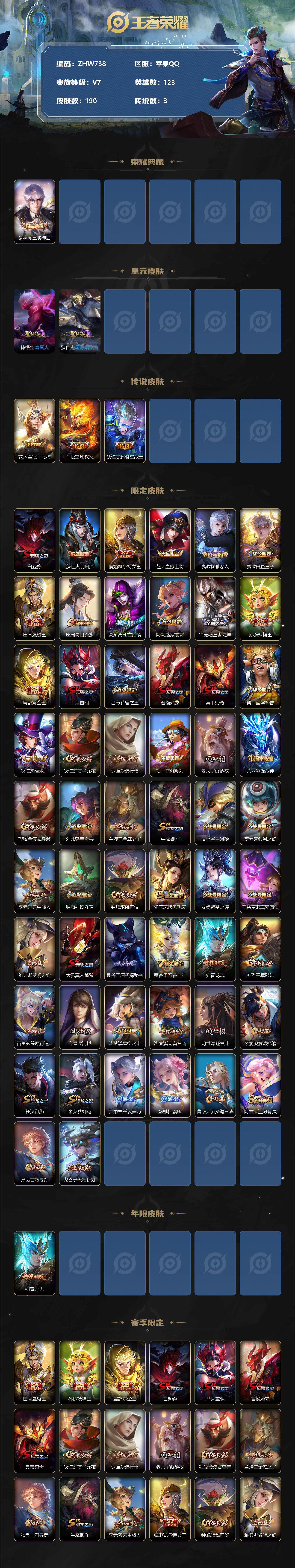 [13099433]【特价急出/详情看图】苹果Q-V7-尊贵铂金III段位-123英雄-190皮肤-1典藏-0珍品无双-0无双-0珍品传说-3传说-41史诗