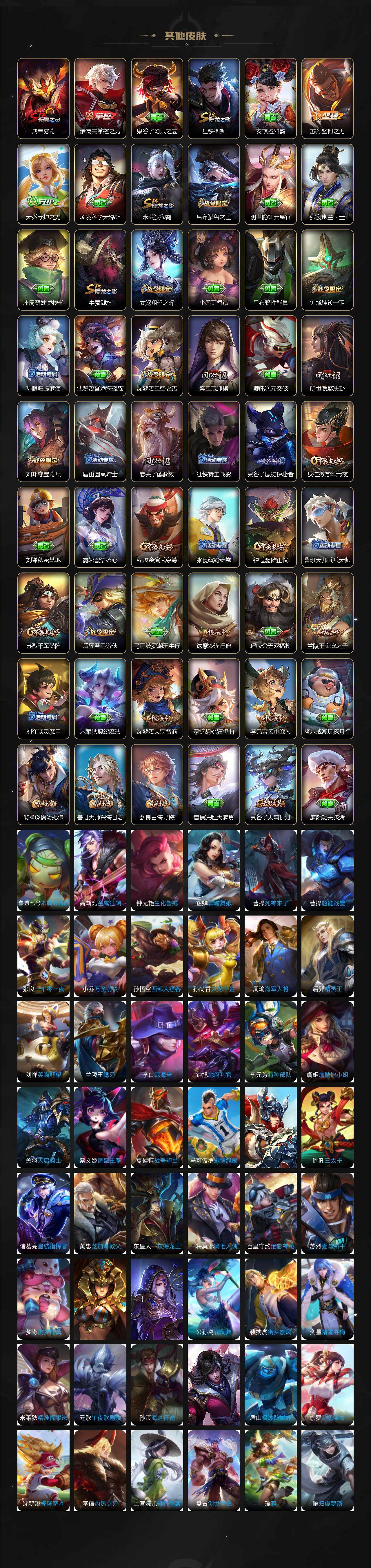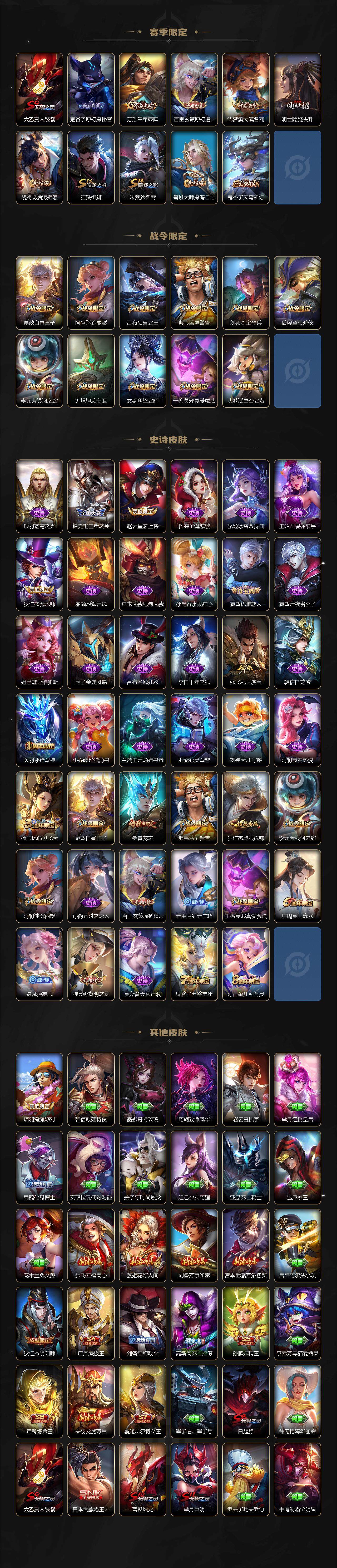 【赛季限定】:庄周蜃楼王,孙膑妖精王,扁鹊炼金王,白起狰,芈月重明,曹操烛龙,典韦穷奇,狄仁杰万华元夜,达摩沙漠行僧,老夫子醍醐杖,程咬金演武夺筹,兰陵王金庭之子,张良古海寻踪,牛魔御旌,李元芳云中旅人,虞姬凯尔特女王,钟馗驱傩正仪,雅典娜黎明之约,太乙真人饕餮,鬼谷子原初探秘者,苏烈千军破阵,百里玄策原初追逐者,弈星混沌棋,沈梦溪大漠名商,明世隐疑决卦,裴擒虎擒涛扼浪,狂铁御狮,米莱狄御霄,鲁班大师探海日志,鬼谷子天穹祈灯