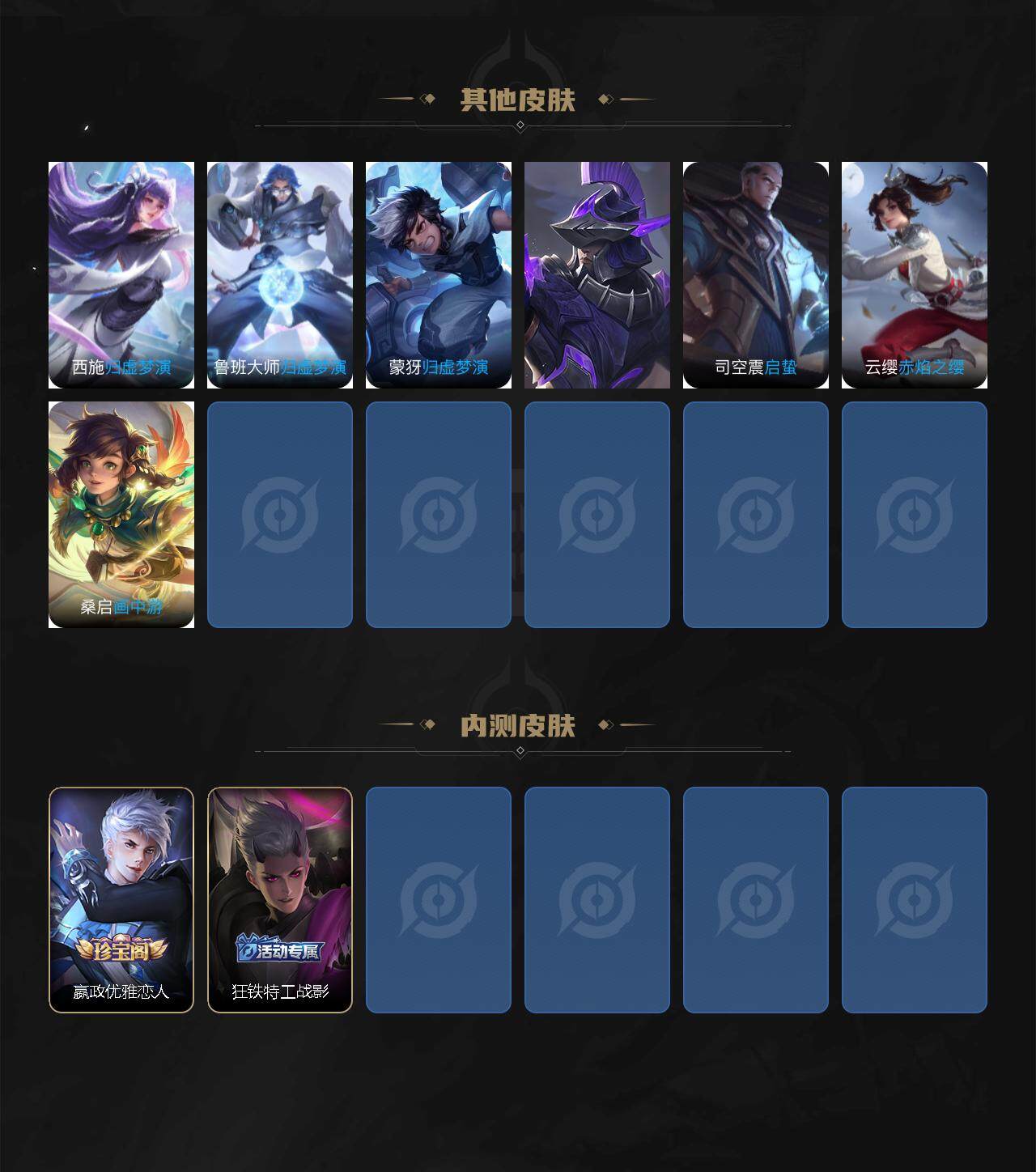 【限定皮肤】:白起狰,狄仁杰阴阳师,虞姬凯尔特女王,赵云皇家上将,嬴政优雅恋人,嬴政白昼王子,庄周蜃楼王,庄周高山流水,高渐离死亡摇滚,阿轲迷踪丽影,钟无艳王者之锤,孙膑妖精王,扁鹊炼金王,芈月重明,吕布猎兽之王,曹操烛龙,典韦穷奇,典韦蓝屏警告,狄仁杰魔术师,狄仁杰万华元夜,达摩沙漠行僧,项羽海滩派对,老夫子醍醐杖,关羽冰锋战神,程咬金演武夺筹,刘邦夺宝奇兵,兰陵王金庭之子,牛魔御旌,后羿圣弓游侠,李元芳银河之约,李元芳云中旅人,钟馗神迹守卫,钟馗驱傩正仪,杨玉环遇见飞天,女娲朔望之晖,干将莫邪真爱魔法,雅典娜黎明之约,太乙真人饕餮,鬼谷子原初探秘者,鬼谷子五谷丰年,铠青龙志,苏烈千军破阵,百里玄策原初追逐者,弈星混沌棋,沈梦溪星空之诺,沈梦溪大漠名商,明世隐疑决卦,裴擒虎擒涛扼浪,狂铁御狮,米莱狄御霄,云中君纤云弄巧,嫦娥拒霜思,鲁班大师探海日志,阿古朵江河有灵,张良古海寻踪,鬼谷子天穹祈灯