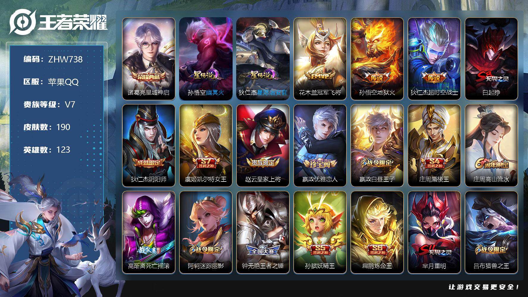 [13099433]【特价急出/详情看图】苹果Q-V7-尊贵铂金III段位-123英雄-190皮肤-1典藏-0珍品无双-0无双-0珍品传说-3传说-41史诗 【荣耀典藏】:诸葛亮星域神启 【传说皮肤】:花木兰冠军飞将,孙悟空地狱火,狄仁杰超时空战士 【限定皮肤】:白起狰,狄仁杰阴阳师,虞姬凯尔特女王,赵云皇家上将,嬴政优雅恋人,嬴政白昼王子,庄周蜃楼王,庄周高山流水,高渐离死亡摇滚,阿轲迷踪丽影,钟无艳王者之锤,孙膑妖精王,扁鹊炼金王,芈月重明,吕布猎兽之王,曹操烛龙,典韦穷奇,典韦蓝屏警告,狄仁杰魔术师,狄仁杰万华元夜,达摩沙漠行僧,项羽海滩派对,老夫子醍醐杖,关羽冰锋战神,程咬金演武夺筹,刘邦夺宝奇兵,兰陵王金庭之子,牛魔御旌,后羿圣弓游侠,李元芳银河之约,李元芳云中旅人,钟馗神迹守卫,钟馗驱傩正仪,杨玉环遇见飞天,女娲朔望之晖,干将莫邪真爱魔法,雅典娜黎明之约,太乙真人饕餮,鬼谷子原初探秘者,鬼谷子五谷丰年,铠青龙志,苏烈千军破阵,百里玄策原初追逐者,弈星混沌棋,沈梦溪星空之诺,沈梦溪大漠名商,明世隐疑决卦,裴擒虎擒涛扼浪,狂铁御狮,米莱狄御霄,云中君纤云弄巧,嫦娥拒霜思,鲁班大师探海日志,阿古朵江河有灵,张良古海寻踪,鬼谷子天穹祈灯 【年限皮肤】:铠青龙志 【赛季限定】:庄周蜃楼王,孙膑妖精王,扁鹊炼金王,白起狰,芈月重明,曹操烛龙,典韦穷奇,狄仁杰万华元夜,达摩沙漠行僧,老夫子醍醐杖,程咬金演武夺筹,兰陵王金庭之子,张良古海寻踪,牛魔御旌,李元芳云中旅人,虞姬凯尔特女王,钟馗驱傩正仪,雅典娜黎明之约,太乙真人饕餮,鬼谷子原初探秘者,苏烈千军破阵,百里玄策原初追逐者,弈星混沌棋,沈梦溪大漠名商,明世隐疑决卦,裴擒虎擒涛扼浪,狂铁御狮,米莱狄御霄,鲁班大师探海日志,鬼谷子天穹祈灯 【战令限定】:嬴政白昼王子,阿轲迷踪丽影,吕布猎兽之王,典韦蓝屏警告,刘邦夺宝奇兵,后羿圣弓游侠,李元芳银河之约,钟馗神迹守卫,女娲朔望之晖,干将莫邪真爱魔法,沈梦溪星空之诺 【史诗皮肤】:项羽苍穹之光,钟无艳王者之锤,赵云皇家上将,貂蝉圣诞恋歌,甄姬冰雪圆舞曲,王昭君偶像歌手,狄仁杰魔术师,廉颇地狱岩魂,宫本武藏鬼剑武藏,孙尚香水果甜心,嬴政优雅恋人,嬴政暗夜贵公子,妲己魅力维加斯,墨子金属风暴,吕布圣诞狂欢,李白千年之狐,张飞乱世虎臣,韩信白龙吟,关羽冰锋战神,小乔缤纷独角兽,兰陵王暗隐猎兽者,亚