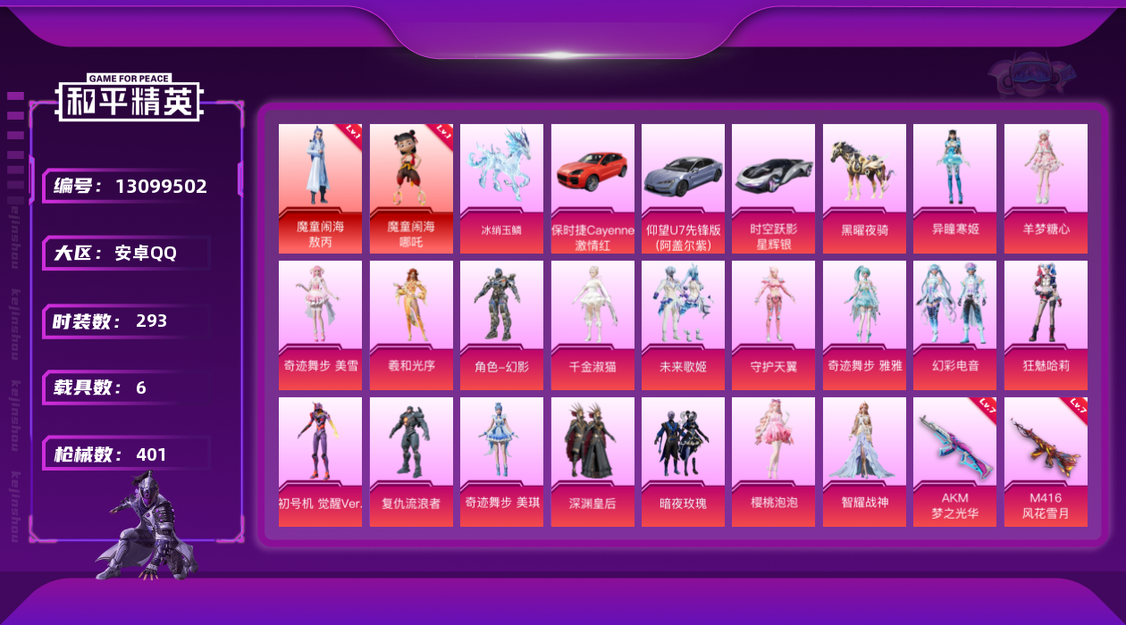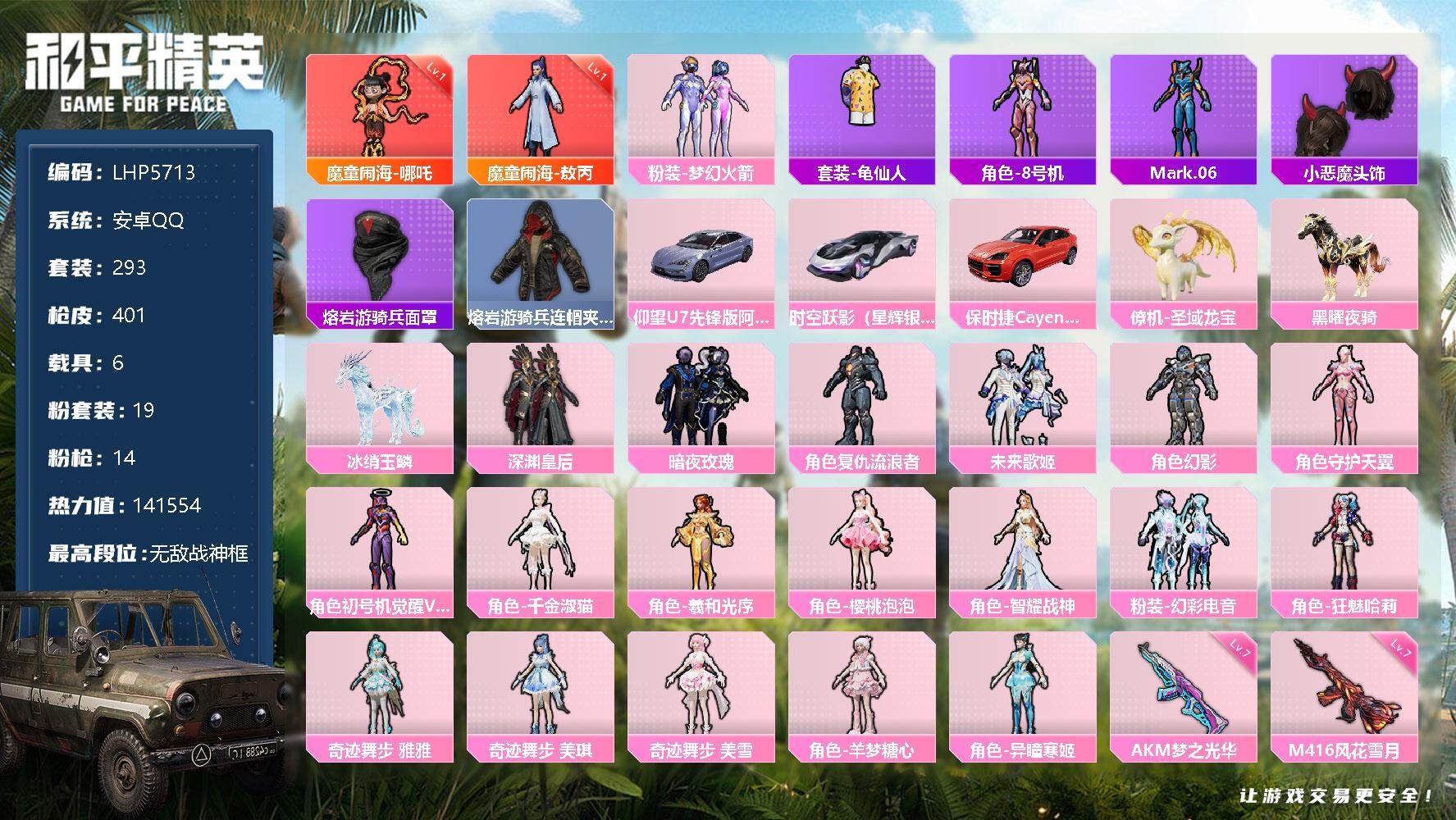 [13099502]素材身法号/无敌战神框1/绝世印记2 安卓 手Q-无敌战神框-2神装-19粉装-14特效枪-6载具-15粉色飞行器-14.1w热力值-21王牌印记-293套装-401枪皮【红色神装等级】:魔童闹海-敖丙(一级),魔童闹海-哪吒(一级)【热门品类】:粉装-梦幻火箭,套装-龟仙人,角色-8号机,角色-Mark.06,小恶魔头饰,熔岩游骑兵面罩,熔岩游骑兵连帽夹克【粉色载具】:仰望U7(阿盖尔紫),时空跃影(星辉银),保时捷Cayenne(激情红),僚机-圣域龙宝,黑曜夜骑,冰绡玉鳞【粉色套装】:粉装-深渊皇后,粉装-梦幻火箭,粉装-暗夜玫瑰,角色-复仇流浪者,粉装-未来歌姬,角色-幻影,角色-守护天翼,角色-初号机 觉醒Ver.,角色-千金淑猫,角色-羲和光序,角色-樱桃泡泡,角色-智耀战神,粉装-幻彩电音,角色-狂魅哈莉,角色-奇迹舞步 雅雅,角色-奇迹舞步 美琪,角色-奇迹舞步 美雪,角色-羊梦糖心,角色-异瞳寒姬【粉色枪皮等级】:AKM-梦之光华(七级),AKM-幽焰骑士(三级),SCAR-L-金蛇镇世(三级),SCAR-L-魔童闹海 哪吒(三级),M416-风花雪月(七级),GROZA-精灵之光(三级),Vector-环太平洋(七级),P90-魔童闹海 敖丙(三级),Kar98K-巳巳如意(五级),MK12-雪月幻音(五级),DP-28-千金淑猫(七级),DP-28-豹影疾电(五级),MG-36-沧焰双生(五级),平底锅-喜羊羊与灰太狼(二级)【粉色飞行器】:酣梦熊熊飞行器,梦幻火箭飞行器,萌物绒绒飞行器,沙丘之主天马,龙翔九天飞行器,深渊漩涡飞行器,曦光华影飞行器,幽焰列车飞行器,万象金身飞行器,圣域金龙飞行器,雀灵庇佑飞行器,灵猫魔法师飞行器,飞天猪飞行器,灵珠游龙飞行器