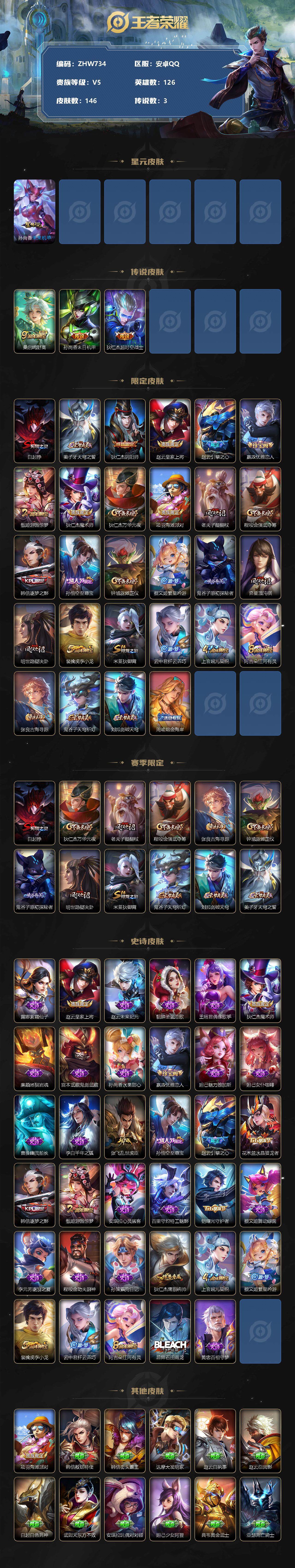 [13099585]【特价急出/详情看图】:安卓Q-V5-至尊星耀V段位-126英雄-146皮肤-1星元-3传说-35史诗 【英雄全皮】:影全皮 【传说皮肤】:桑启鸣野蒿,孙尚香末日机甲,狄仁杰超时空战士 【限定皮肤】:白起狰,姜子牙天穹之誓,狄仁杰阴阳师,赵云皇家上将,赵云引擎之心,嬴政优雅恋人,甄姬游园惊梦,狄仁杰魔术师,狄仁杰万华元夜,项羽海滩派对,老夫子醍醐杖,程咬金演武夺筹,韩信逐梦之影,孙悟空至尊宝,钟馗驱傩正仪,蔡文姬繁星吟游,鬼谷子原初探秘者,弈星混沌棋,明世隐疑决卦,裴擒虎李小龙,米莱狄御霄,云中君纤云弄巧,上官婉儿梁祝,阿古朵江河有灵,张良古海寻踪,鬼谷子天穹祈灯,刘邦剑破天穹,周瑜熔金海岸 【赛季限定】:白起狰,狄仁杰万华元夜,老夫子醍醐杖,程咬金演武夺筹,张良古海寻踪,钟馗驱傩正仪,鬼谷子原初探秘者,弈星混沌棋,明世隐疑决卦,米莱狄御霄,鬼谷子天穹祈灯,刘邦剑破天穹,姜子牙天穹之誓 【史诗皮肤】:露娜紫霞仙子,赵云皇家上将,赵云未来纪元,貂蝉圣诞恋歌,王昭君偶像歌手,狄仁杰魔术师,廉颇地狱岩魂,宫本武藏鬼剑武藏,孙尚香水果甜心,嬴政优雅恋人,妲己魅力维加斯,妲己女仆咖啡,曹操幽灵船长,李白千年之狐,张飞乱世虎臣,孙悟空至尊宝,赵云引擎之心,花木兰水晶猎龙者,韩信逐梦之影,甄姬游园惊梦,安琪拉心灵骇客,百里守约特工魅影,铠曙光守护者,蔡文姬舞动绿茵,李元芳逐浪之夏,程咬金功夫厨神,孙策猫狗日记,狄仁杰鹰眼统帅,上官婉儿梁祝,蔡文姬繁星吟游,裴擒虎李小龙,云中君纤云弄巧,阿古朵江河有灵,后羿石田雨龙,黄忠百相守梦 【其他皮肤】:项羽海滩派对,韩信教廷特使,韩信街头霸王,达摩大发明家,赵云白执事,赵云忍炎影,白起白色死神,武则天东方不败,安琪拉玩偶对对碰,妲己少女阿狸,典韦黄金武士,亚瑟死亡骑士,花木兰兔女郎,刘备万事如意,宫本武藏万象初新,狄仁杰阴阳师,关羽龙腾万里,白起狰,钟无艳海滩丽影,宫本武藏霸王丸,王昭君幻想奇妙夜,狂铁命运角斗场,老夫子功夫老勺,孙尚香沉稳之力,诸葛亮掌控之力,李白敏锐之力,项羽科学大爆炸,米莱狄御霄,庄周奇妙博物学,孙膑归虚梦演,沈梦溪鲨炮海盗猫,弈星混沌棋,哪吒次元突破,明世隐疑决卦,盾山圆桌骑士,老夫子醍醐杖,鬼谷子原初探秘者,狄仁杰万华元夜,杨戬次元傲视,露娜瓷语鉴心,程咬金演武夺筹,张良缤纷绘卷,钟馗驱傩正仪,鲁班大师乓乓大师,