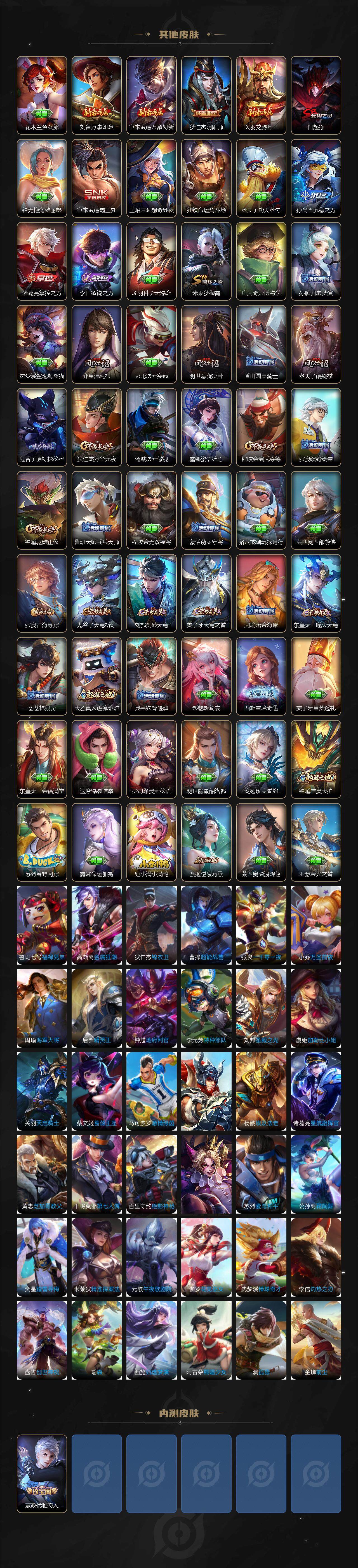 【限定皮肤】:白起狰,姜子牙天穹之誓,狄仁杰阴阳师,赵云皇家上将,赵云引擎之心,嬴政优雅恋人,甄姬游园惊梦,狄仁杰魔术师,狄仁杰万华元夜,项羽海滩派对,老夫子醍醐杖,程咬金演武夺筹,韩信逐梦之影,孙悟空至尊宝,钟馗驱傩正仪,蔡文姬繁星吟游,鬼谷子原初探秘者,弈星混沌棋,明世隐疑决卦,裴擒虎李小龙,米莱狄御霄,云中君纤云弄巧,上官婉儿梁祝,阿古朵江河有灵,张良古海寻踪,鬼谷子天穹祈灯,刘邦剑破天穹,周瑜熔金海岸
