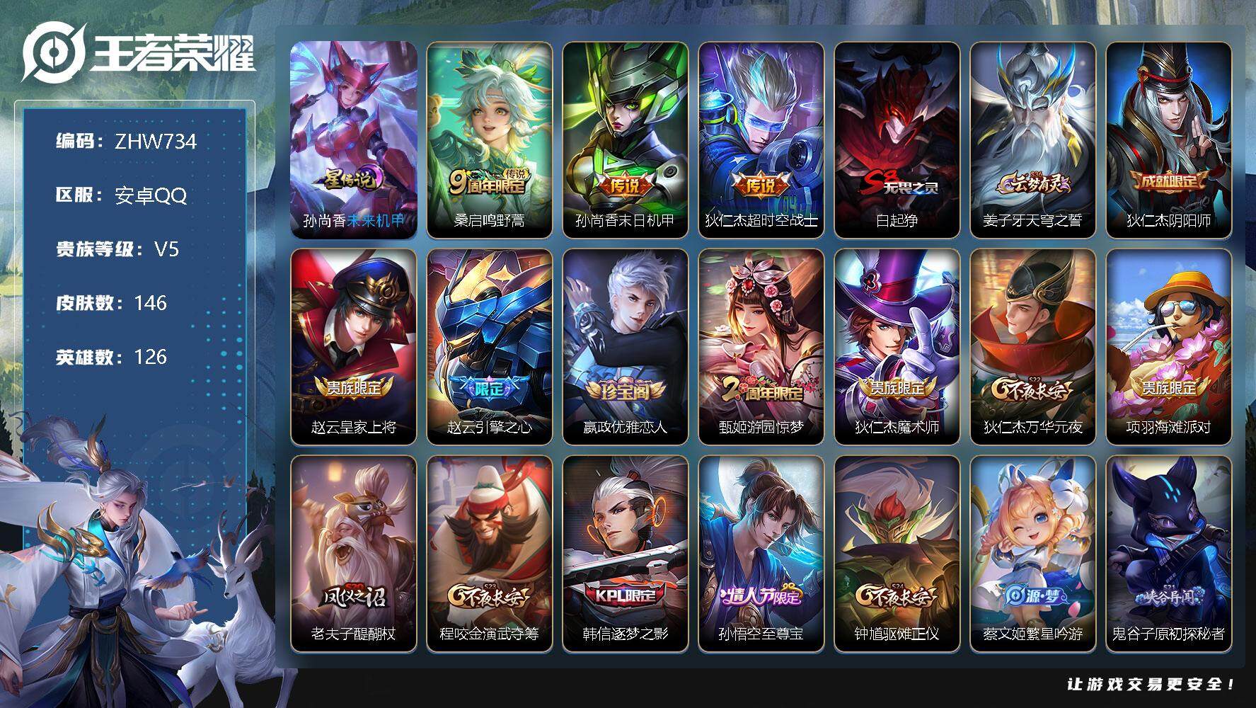 [13099585]【特价急出/详情看图】:安卓Q-V5-至尊星耀V段位-126英雄-146皮肤-1星元-3传说-35史诗