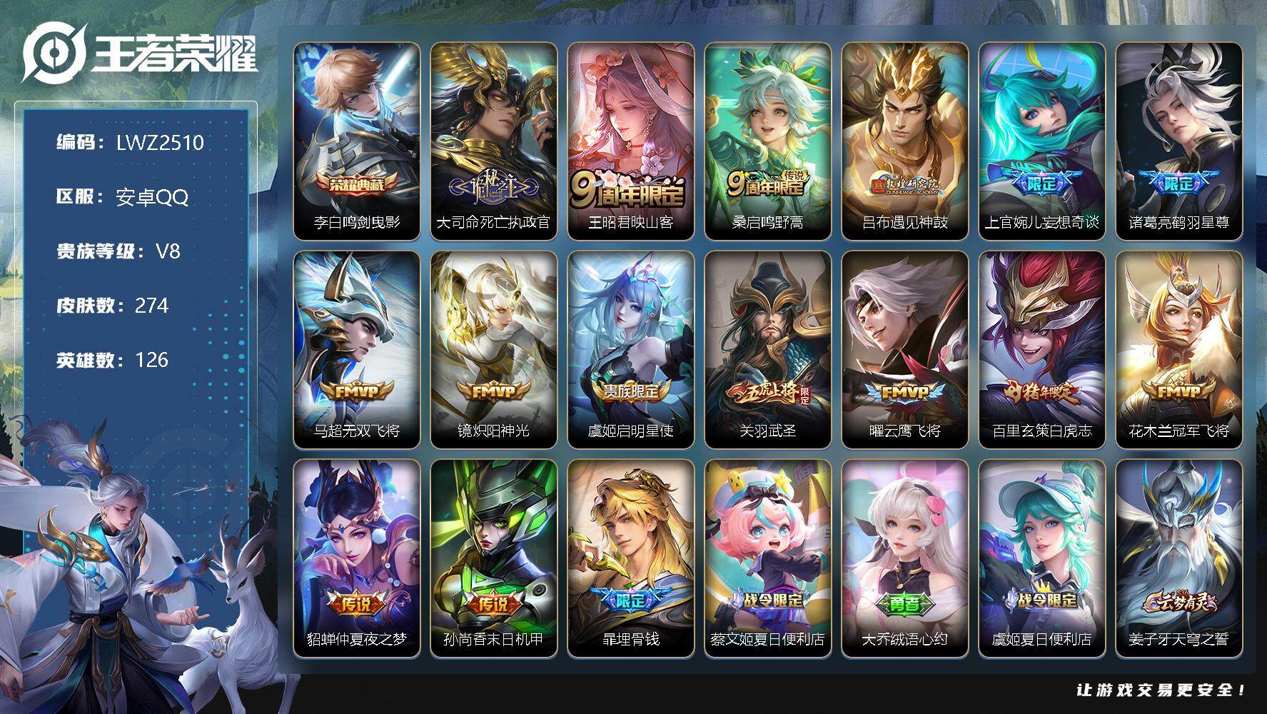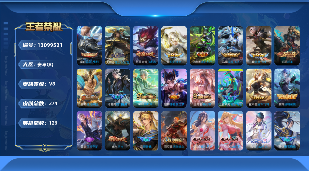 [13099521]安卓Q-V8-至尊星耀III段位-126英雄-274皮肤-1典藏-15传说-90史诗 【英雄全皮】:大司命全皮,海诺全皮 【荣耀典藏】:李白鸣剑曳影 【传说皮肤】:大司命死亡执政官,王昭君映山客,桑启鸣野蒿,吕布遇见神鼓,上官婉儿妄想奇谈,诸葛亮鹤羽星尊,马超无双飞将,镜炽阳神光,虞姬启明星使,关羽武圣,曜云鹰飞将,百里玄策白虎志,花木兰冠军飞将,貂蝉仲夏夜之梦,孙尚香末日机甲 【限定皮肤】:暃埋骨钱,蔡文姬夏日便利店,大乔绒语心约,虞姬夏日便利店,姜子牙天穹之誓,杨戬破阵退雄兵,狄仁杰阴阳师,赵云皇家上将,墨子神迹守卫,孙尚香蔷薇恋人,庄周高山流水,高渐离玩趣恶龙,钟无艳超时空战士,孙膑天狼运算者,孙膑寅虎展翼,白起夜都怪侠,芈月幻夜卜梦,吕布遇见神鼓,元歌云间偶戏,元歌无心,甄姬游园惊梦,甄姬落雪兰心,典韦岱宗,狄仁杰魔术师,狄仁杰万华元夜,达摩星际陆战队,达摩沙漠行僧,项羽海滩派对,老夫子醍醐杖,老夫子航海奇遇记,关羽武圣,安琪拉魔法小厨娘,程咬金演武夺筹,韩信傲雪梅枪,王昭君午后时光,兰陵王金庭之子,亚瑟潮玩骑士王,后羿圣弓游侠,李元芳银河之约,李元芳云中旅人,虞姬启明星使,钟馗神迹守卫,钟馗驱傩正仪,干将莫邪真爱魔法,雅典娜单词大作战,鬼谷子原初探秘者,鬼谷子五谷丰年,诸葛亮鹤羽星尊,黄忠火炮绅士,苏烈千军破阵,百里玄策白虎志,弈星混沌棋,梦奇顽趣,沈梦溪大漠名商,明世隐疑决卦,明世隐吟游魔法,裴擒虎李小龙,裴擒虎擒涛扼浪,狂铁电玩高手,米莱狄胡桃异想国,云中君纤云弄巧,伽罗天狼溯光者,上官婉儿梁祝,上官婉儿妄想奇谈,嫦娥拒霜思,蒙犽狂想玩偶喵,鲁班大师探海日志,桑启海盐诗旅,艾琳流音漫舞,司空震地狱燃心,阿古朵江河有灵,张良古海寻踪,蒙犽百解令,高渐离燃音魔法,妲己灵卜魔法,鬼谷子天穹祈灯,沈梦溪龙舞盛年,刘邦剑破天穹,程咬金群星魔术团,关羽决胜骁骑,镜青焰无极,项羽苍威无极,海诺心动手记,芈月浮光幕影,周瑜熔金海岸 【年限皮肤】:百里玄策白虎志,孙膑寅虎展翼,典韦岱宗,关羽武圣 【赛季限定】:狄仁杰万华元夜,达摩沙漠行僧,老夫子醍醐杖,程咬金演武夺筹,兰陵王金庭之子,张良古海寻踪,李元芳云中旅人,钟馗驱傩正仪,鬼谷子原初探秘者,苏烈千军破阵,弈星混沌棋,梦奇顽趣,沈梦溪大漠名商,明世隐疑决卦,裴擒虎擒涛扼浪,鲁班大师探海日志,桑启海盐诗旅,鬼谷子天穹