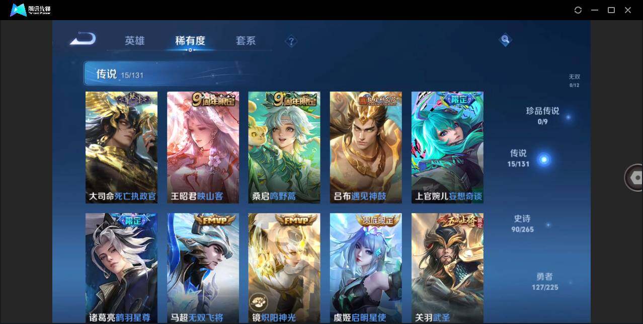 【传说皮肤】:大司命死亡执政官,王昭君映山客,桑启鸣野蒿,吕布遇见神鼓,上官婉儿妄想奇谈,诸葛亮鹤羽星尊,马超无双飞将,镜炽阳神光,虞姬启明星使,关羽武圣,曜云鹰飞将,百里玄策白虎志,花木兰冠军飞将,貂蝉仲夏夜之梦,孙尚香末日机甲