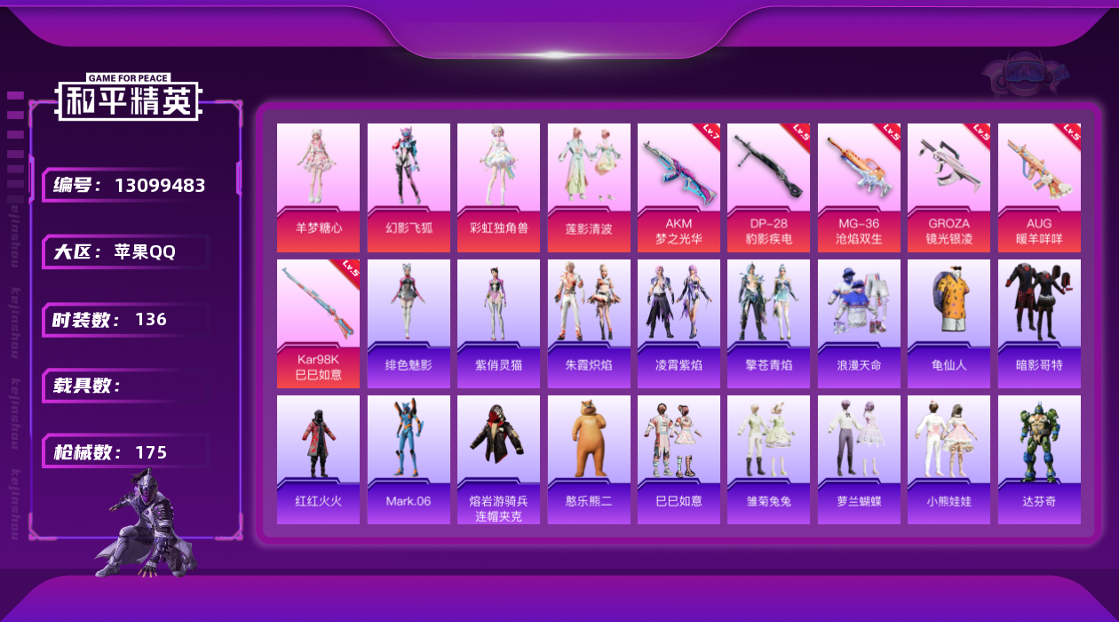 - [12578250]苹果 手Q-12粉装-9特效枪-1载具-5粉色飞行器-65954热力值-10王牌印记-148套装-200枪皮 【热门品类】:粉装-梦幻火箭,套装-深海小丑鱼,角色-军刀雅典娜,套装-动感兔斯基人偶服,套装-龟仙人,套装-糯粉咩咩,套装-红熊茄茄 【粉色载具】:双人摩托-梦幻火箭 【粉色套装】:粉装-宝贝奶油派,粉装-梦幻火箭,粉装-甜蜜誓约,粉装-绚金战神,粉装-馨动时刻,角色-洛天依,角色-复仇流浪者,角色-幻影,粉装-闲梦青缨,角色-圣堂之誓,粉装-蜜语绒猫,角色-光极星 【粉色枪皮等级】:SCAR-L-梦幻火箭(五级),M416-暖熊萌萌(六级),UMP45-相思残雪(七级),UMP45-恐龙拽拽(四级),Vector-环太平洋(四级),P90-沙丘之主(三级),Kar98K-巳巳如意(二级),M24-镜域双华(三级),DP-28-豹影疾电(一级) 【粉色枪皮】:SCAR-L-梦幻火箭,M416-暖熊萌萌,UMP45-相思残雪,UMP45-恐龙拽拽,Vector-环太平洋,P90-沙丘之主,Kar98K-巳巳如意,M24-镜域双华,DP-28-豹影疾电 【粉色飞行器】:梦幻火箭飞行器,暖熊萌萌飞行器,沙丘之主天马,繁龙极客飞行器,镜域双华-灵镜之阶 【粉色降落伞】:梦幻火箭降落伞,甜蜜誓约降落伞,四圣焕新降落伞,星之彼岸降落伞,恐龙拽拽降落伞,环太平洋降落伞,垂柳戏鸭降落伞,彩虹甜喵降落伞,仲夏莫吉托降落伞,龙珠超降落伞,闲梦青缨降落伞,彩装战姬降落伞,圣堂之誓降落伞,沙丘之主降落伞,鎏金朋克降落伞,江南烟雨降落伞,智耀战神降落伞 【稀有套装】:套装-龟仙人,套装-粉恋花,套装-紫幽梦,套装-蓝冰羽,角色-瑰梦爱神,角色-时希公主 【稀有枪皮】:AKM-影袭,AKM-恐龙拽拽,AKM-环太平洋,AKM-破晓战魂,AKM-虎虎生威,AKM-龙的传人,M16A4-凝视深渊,M16A4-天使羽翼,SCAR-L-炫彩节奏,SCAR-L-甜蜜誓约,SCAR-L-粉锦千层,M416-糯团青竹,M416-绯红前夜,M416-蓝色火焰,GROZA-异彩先驱,GROZA-影袭,GROZA-恐龙拽拽,GROZA-懵萌河马,GROZA-生命誓言,GROZA-田园牧歌,GROZA-黑色刀锋,AUG-耀粉歌者,AUG-闲梦青缨,QBZ-原初圣火,QBZ-未来歌姬,QBZ-相思残雪,Q
