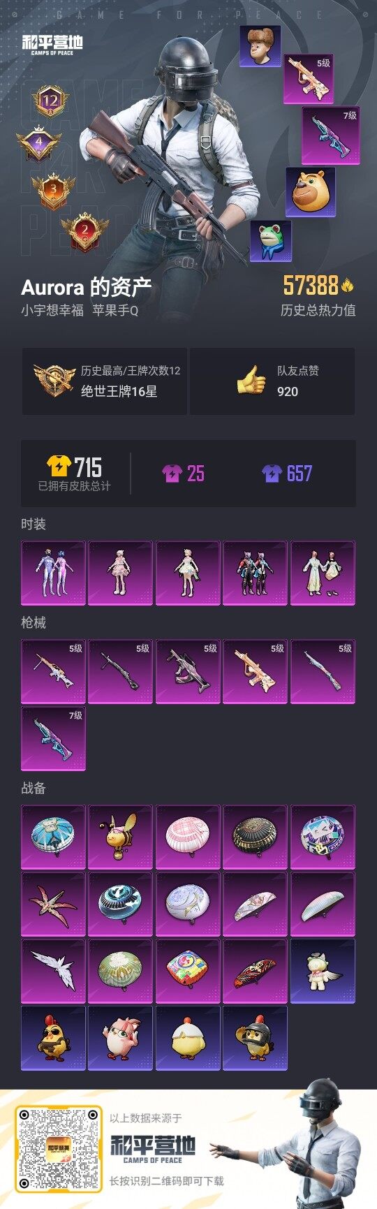 - PX_2101264-??/枪械8/装备246/载具1/战备130/王牌印记12/热力值70781/五级AKM-梦之光华/六级SCAR-L-梦幻火箭/一级M416-五爪金龙/七级M416-暖熊萌萌/四级Vector-环太平洋/三级Vector-最终圣卫者/五级P90-能量风暴/三级Kar98K-未来歌姬/一级最终圣卫者-帕修斯/最终圣卫者-帕修斯/宝马M4(圣保罗黄)/极限特训/梦幻火箭/炙焰红王
