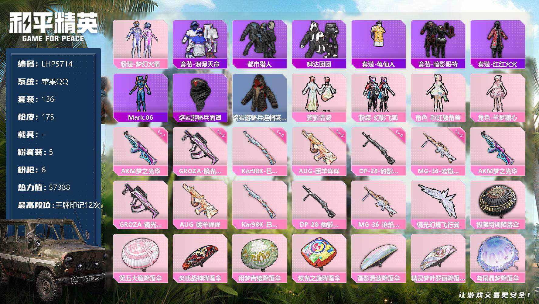 [13099483]绝世印记2/地铁满天赋 苹果 手Q-5粉装-6特效枪-0载具-3粉色飞行器-5.7w热力值-12王牌印记-136套装-175枪皮【热门品类】:粉装-梦幻火箭,套装-浪漫天命,套装-都市猎人,套装-胖达团团,套装-龟仙人,套装-暗影哥特,套装-红红火火,角色-Mark.06,熔岩游骑兵面罩,熔岩游骑兵连帽夹克【粉色套装】:粉装-梦幻火箭,粉装-莲影清波,粉装-幻影飞狐,角色-彩虹独角兽,角色-羊梦糖心【粉色枪皮等级】:AKM-梦之光华(七级),GROZA-镜光银凌(五级),AUG-暖羊咩咩(五级),Kar98K-巳巳如意(五级),DP-28-豹影疾电(五级),MG-36-沧焰双生(五级)【粉色飞行器】:镜光幻境飞行翼