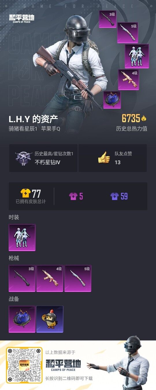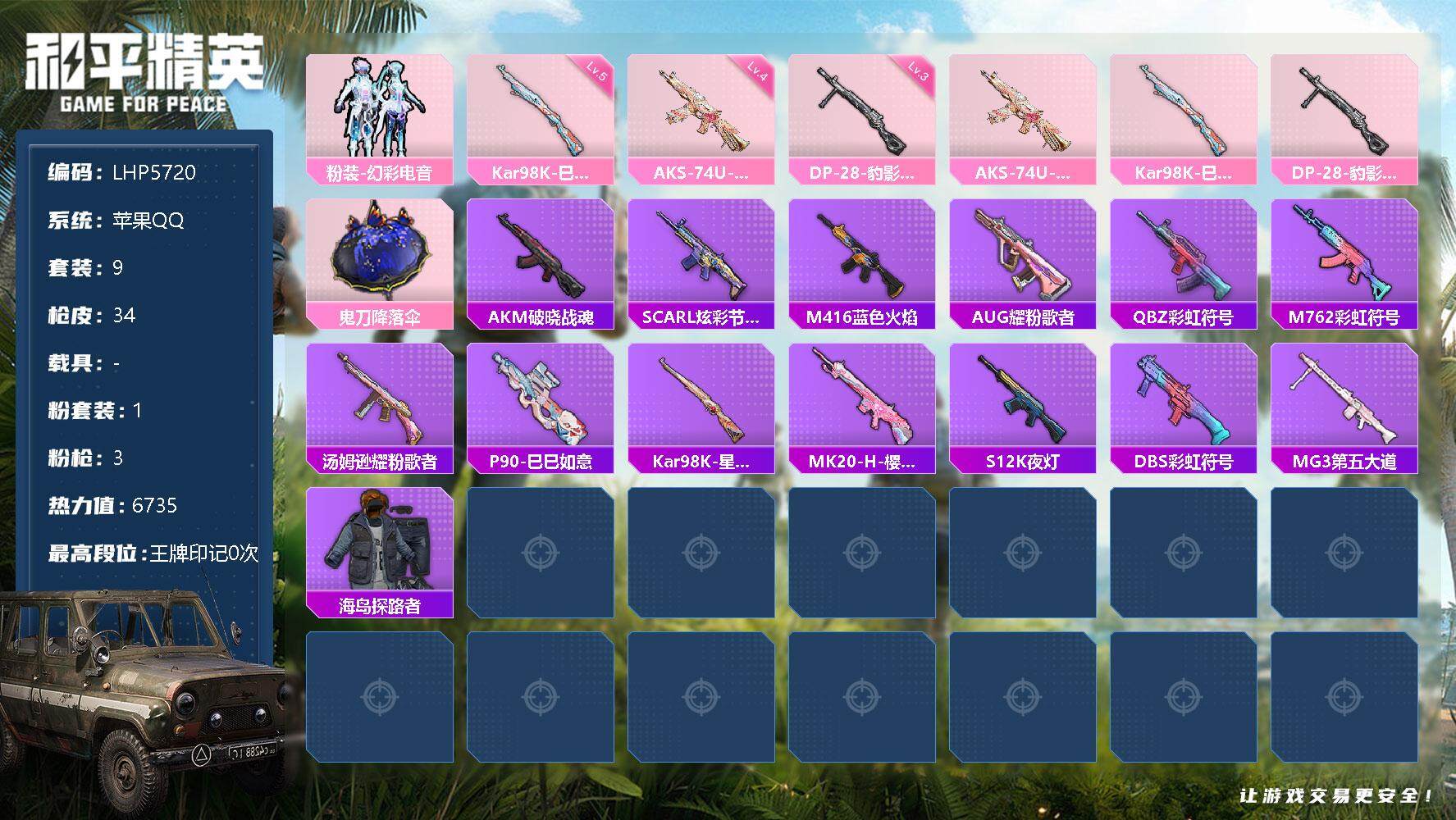 [13099591]苹果 手Q-1粉装-3特效枪-6735热力值-2王牌印记-9套装-34枪皮【粉色套装】:粉装-幻彩电音【粉色枪皮等级】:AKS-74U-星穹咏叹调(四级),Kar98K-巳巳如意(五级),DP-28-豹影疾电(三级)