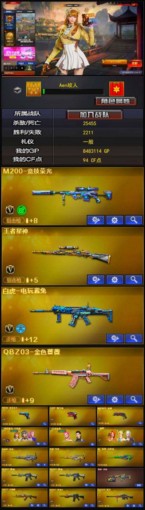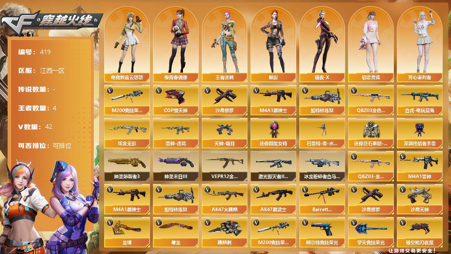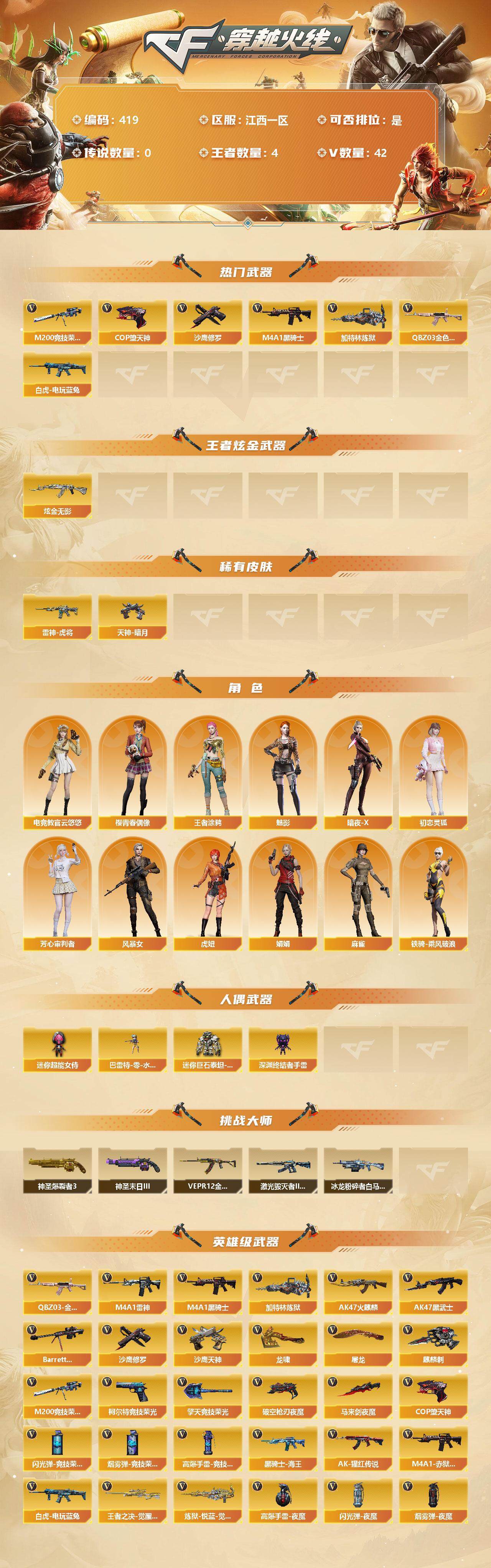 [13099537]【419】40V/100级/元帅/4王者/1炫金/2英雄/QBZ03-金色蔷薇/M200-竞技荣光/白虎-电玩蓝兔/M4A1-黑骑士/加特林-炼狱/COP-堕天神/沙鹰-修罗/炫金无影/雷神-虎将/战神-紫绶金章皮肤/战神-流金岁月皮肤/AK47-B-常胜将军-曹操/天神-暗月/魅影/电竞教官-云悠悠/王者涂鸦/暗夜-X/初恋灵狐/芳心审判者/风暴女/虎妞/娟娟/麻雀/铁骑-乘风破浪/樱-青春偶像/巴雷特-零-水下丽影/迷你超能女侍/迷你巨石泰坦-魔花研究所/深渊终结者手雷/神圣爆裂者/冰龙粉碎者-白马银枪/激光毁灭者III-白马银枪/VEPR-12-金魔/神圣爆裂者-末日/AK47-火麒麟/M4A1-雷神/AK47-黑武士/AK-47-猩红传说/黑骑士-海王/Barrett-毁灭/王者之决-觉醒版/王者星神-觉醒版/炼狱-悦蓝-觉醒版/沙鹰-天神/柯尔特-竞技荣光/破空枪刃-夜魔/屠龙/龙啸/马来剑夜魔/麒麟刺/擎天-竞技荣光/高爆手雷-夜魔/高爆手雷-竞技荣光/闪光弹-夜魔/闪光弹-竞技荣光/烟雾弹-夜魔/烟雾弹-竞技荣光/M4A1-赤狱骑士