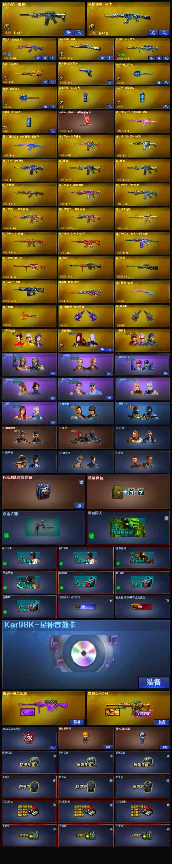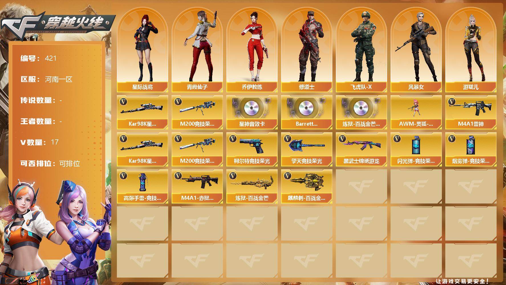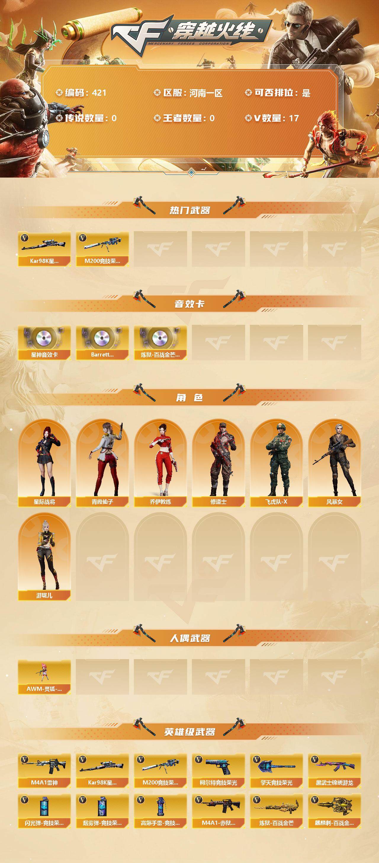 - [12957168]四川一区-49V-17王者-0炫金 【传说武器】:传说圣谕 【传说角色】:传说星骇 【热门武器】:传说圣谕,荣耀世冠-雷神,M4A1-黑骑士,汤姆逊-烈龙*4,RPK-盘龙*6,加特林-炼狱,沙鹰-修罗*3,荣耀世冠-龙啸 【王者炫金武器】:王者之翼,王者之光,王者凌虎,王者冰锋 【音效卡】:AK47-火麒麟音效卡,Barrett-极光音效卡,AWM-裁决音效卡,QBZ03-天罚音效卡 【稀有皮肤】:火麒麟-平天大圣,毁灭-风暴*2 【角色】:王者-瞳-闭月羞花,王者涂鸦,王者-救世主,战地猎狐,玄豹,蜀雪,铁骑荣耀 【人偶武器】:COP-旗袍,迷你生化手雷,灵狐娃娃手雷 【暴走生化】:超级对讲机 【挑战大师】:神圣爆裂者-末日III,激光毁灭者III-白马银枪 【英雄级武器】:擎天-竞技荣光,闪光弹-竞技荣光,幻灵之锋,荣耀世冠-雷神,荣耀世冠-龙啸,M4A1-雷神,M4A1-黑骑士,RPK-盘龙*6,加特林-炼狱,汤姆逊-烈龙*4,Barrett-毁灭,Barrett-极光,AWM-裁决,QBZ03-天罚,M4A1-猎神,VSK-94-金蚀,黑武士-锦绣游龙,黑骑士-海王,M4A1-赤狱骑士,USP-冥王,沙鹰-天神*4,沙鹰-修罗*3,擎天,屠龙 【特殊枪械】:1黑骑士,4烈龙,6盘龙,1炼狱