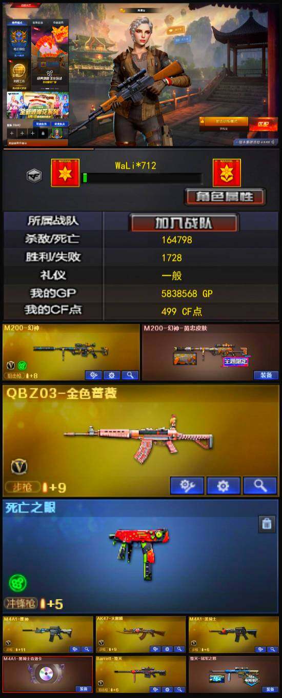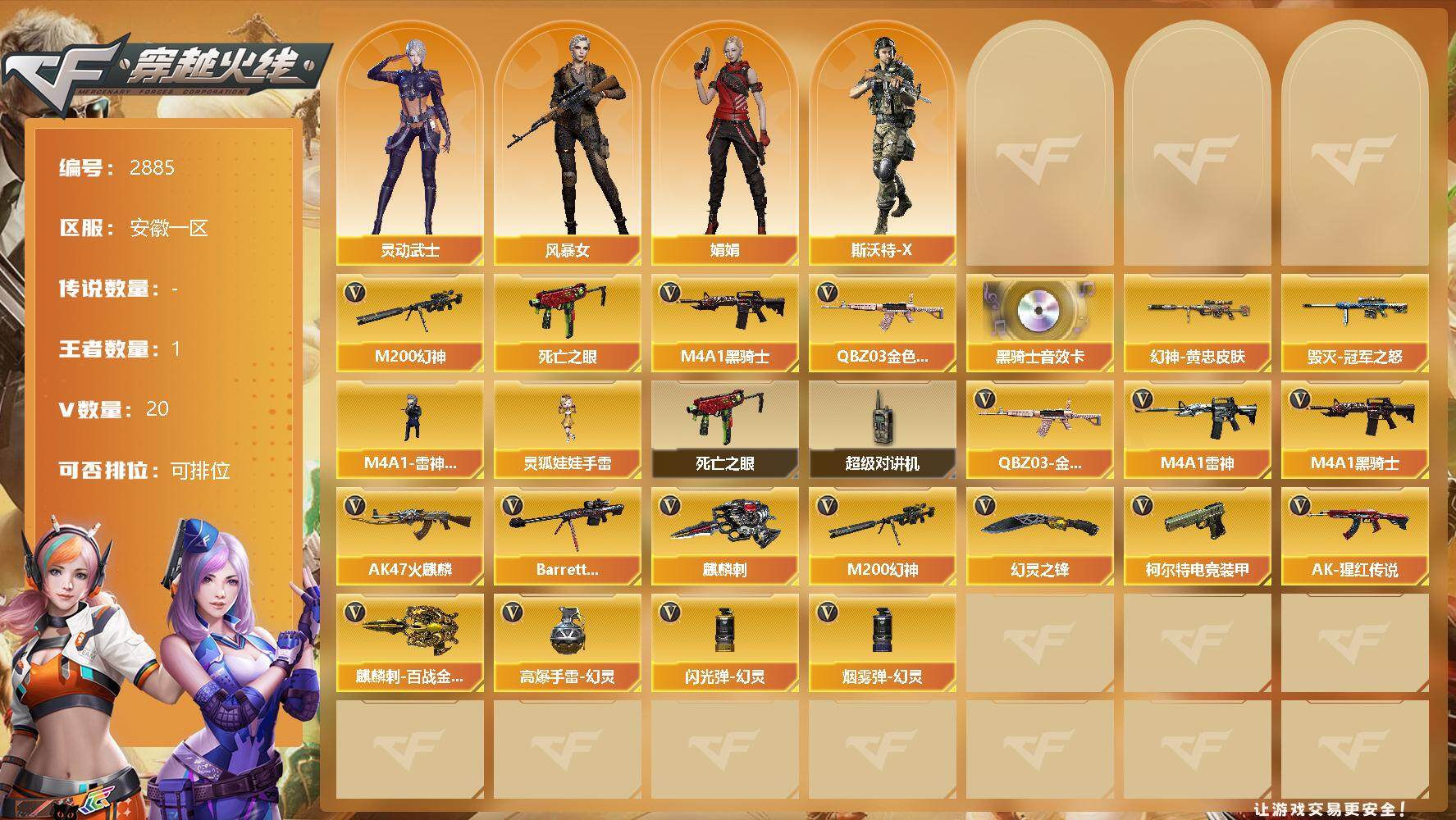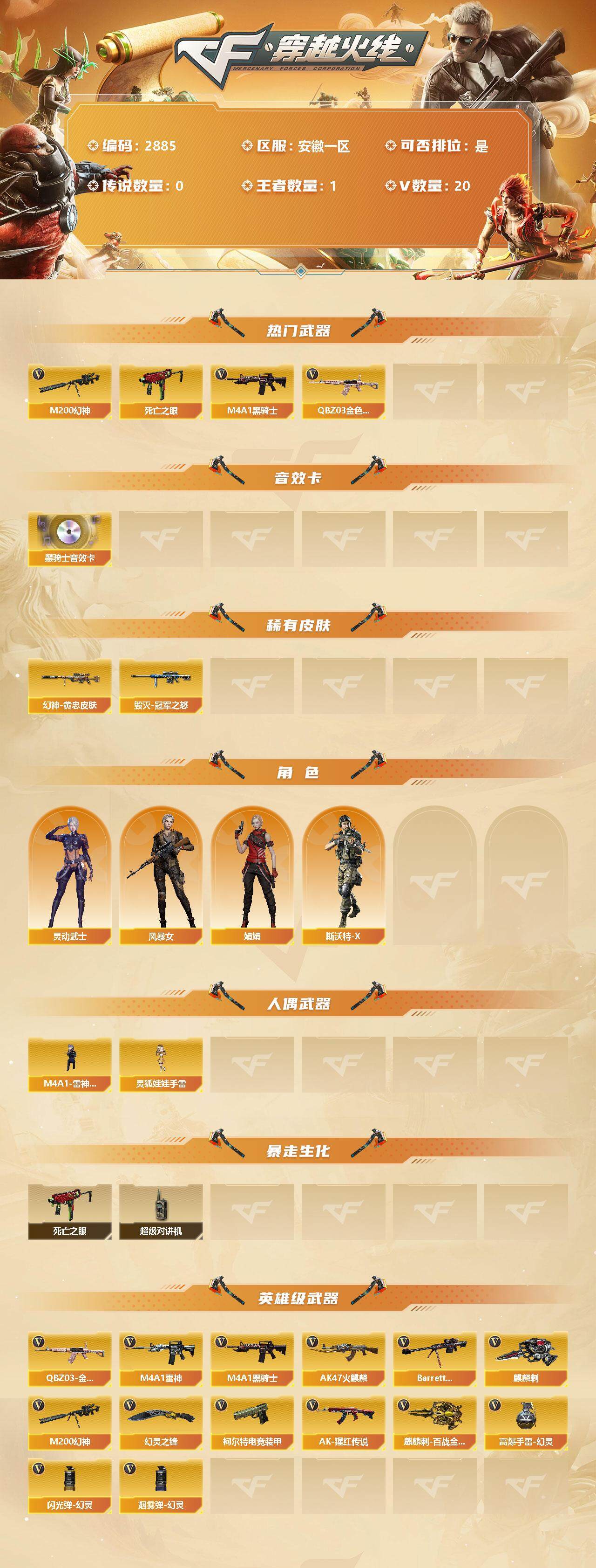 [13099818]安徽一区-20V-1王者-0炫金 【热门武器】:QBZ03-金色蔷薇,M200-幻神,死亡之眼,M4A1-黑骑士 【音效卡】:M4A1-黑骑士音效卡 【皮肤】:M200-幻神-黄忠皮肤,毁灭-冠军之怒,AK47-B-常胜将军-孙权*2,轻型军用手斧-再燃火线 【角色】:风暴女,娟娟,灵动武士,斯沃特-X 【人偶武器】:M4A1-雷神-精英刀锋,灵狐娃娃手雷 【暴走生化】:死亡之眼,超级对讲机 【英雄级武器】:AK47-火麒麟,M4A1-雷神,M4A1-黑骑士,QBZ03-金色蔷薇,AK-47-猩红传说*2,Barrett-毁灭,M200-幻神,柯尔特-电竞装甲,麒麟刺,幻灵之锋,麒麟刺-百战金芒,高爆手雷-幻灵,闪光弹-幻灵,烟雾弹-幻灵 【特殊枪械】:1黑骑士