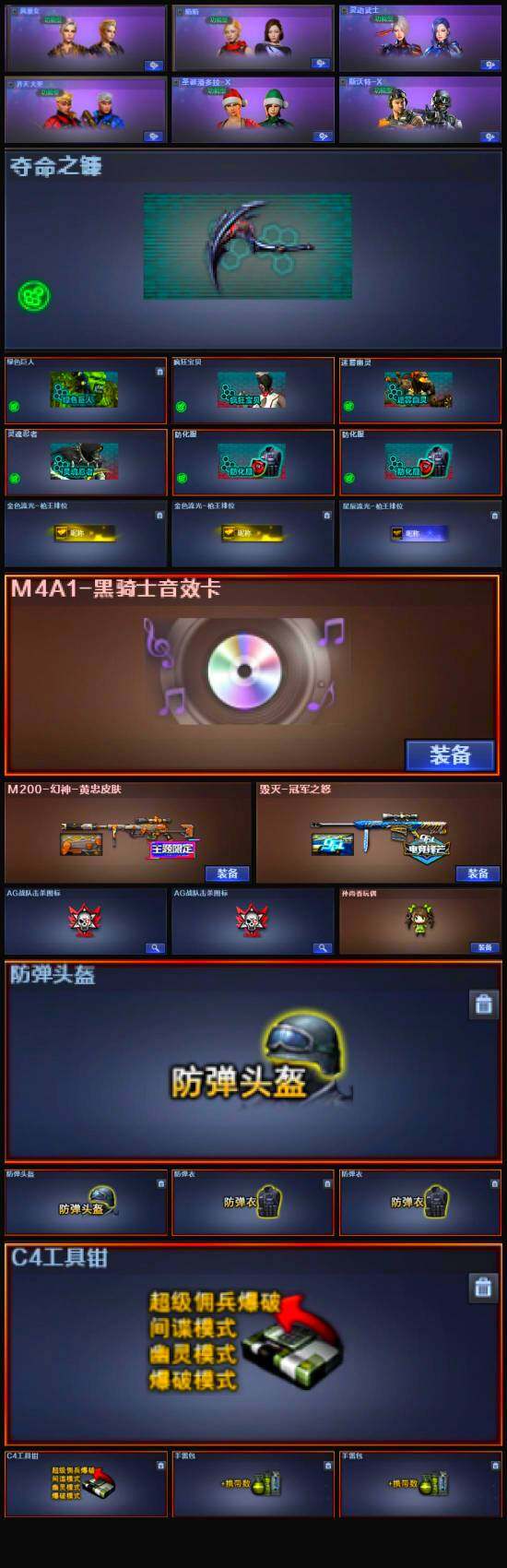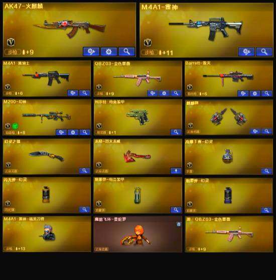 【英雄级武器】:AK47-火麒麟,M4A1-雷神,M4A1-黑骑士,QBZ03-金色蔷薇,AK-47-猩红传说*2,Barrett-毁灭,M200-幻神,柯尔特-电竞装甲,麒麟刺,幻灵之锋,麒麟刺-百战金芒,高爆手雷-幻灵,闪光弹-幻灵,烟雾弹-幻灵