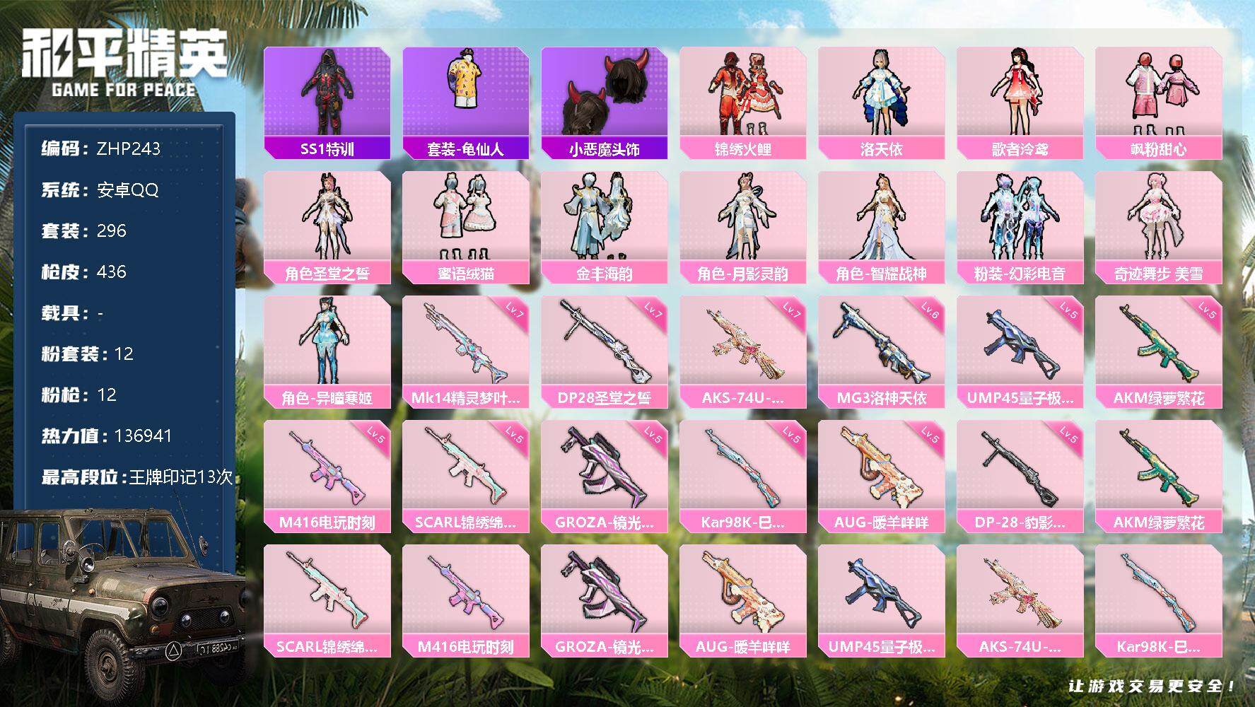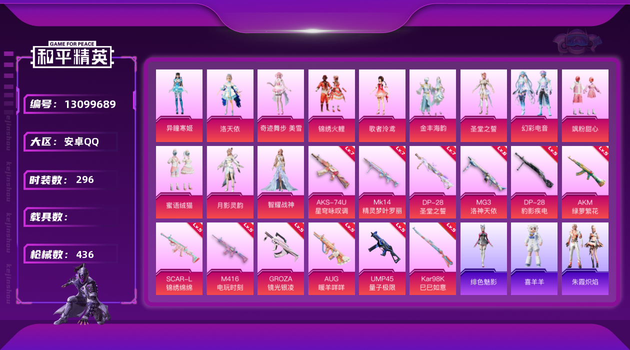 [13099689]素材身法号/地铁满天赋 安卓 手Q-12粉装-12特效枪-10粉色飞行器-13.6w热力值-13王牌印记-296套装-436枪皮【热门品类】:套装-SS1特训,套装-龟仙人,小恶魔头饰【粉色套装】:粉装-锦绣火鲤,角色-洛天依,角色-歌者泠鸢,粉装-飒粉甜心,角色-圣堂之誓,粉装-蜜语绒猫,粉装-金丰海韵,角色-月影灵韵,角色-智耀战神,粉装-幻彩电音,角色-奇迹舞步 美雪,角色-异瞳寒姬【粉色枪皮等级】:AKM-绿萝繁花(五级),SCAR-L-锦绣绵绵(五级),M416-电玩时刻(五级),GROZA-镜光银凌(五级),AUG-暖羊咩咩(五级),UMP45-量子极限(五级),AKS-74U-星穹咏叹调(七级),Kar98K-巳巳如意(五级),Mk14-精灵梦叶罗丽(七级),DP-28-圣堂之誓(七级),DP-28-豹影疾电(五级),MG3-洛神天依(六级)【粉色飞行器】:齐天大圣飞行器,天之羽翼飞行器,星夜魔法师飞行翼,闪光银龙飞行器,萌物绒绒飞行器,镜光幻境飞行翼,绝色倾城飞行器,动力核心飞行器,圣域金龙飞行器,终晖之翼飞行器