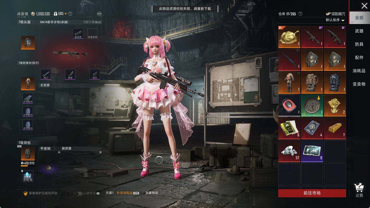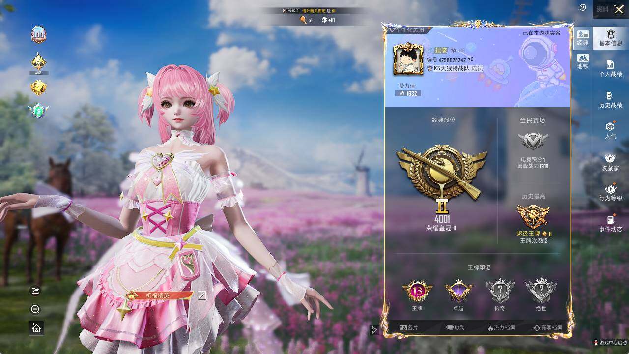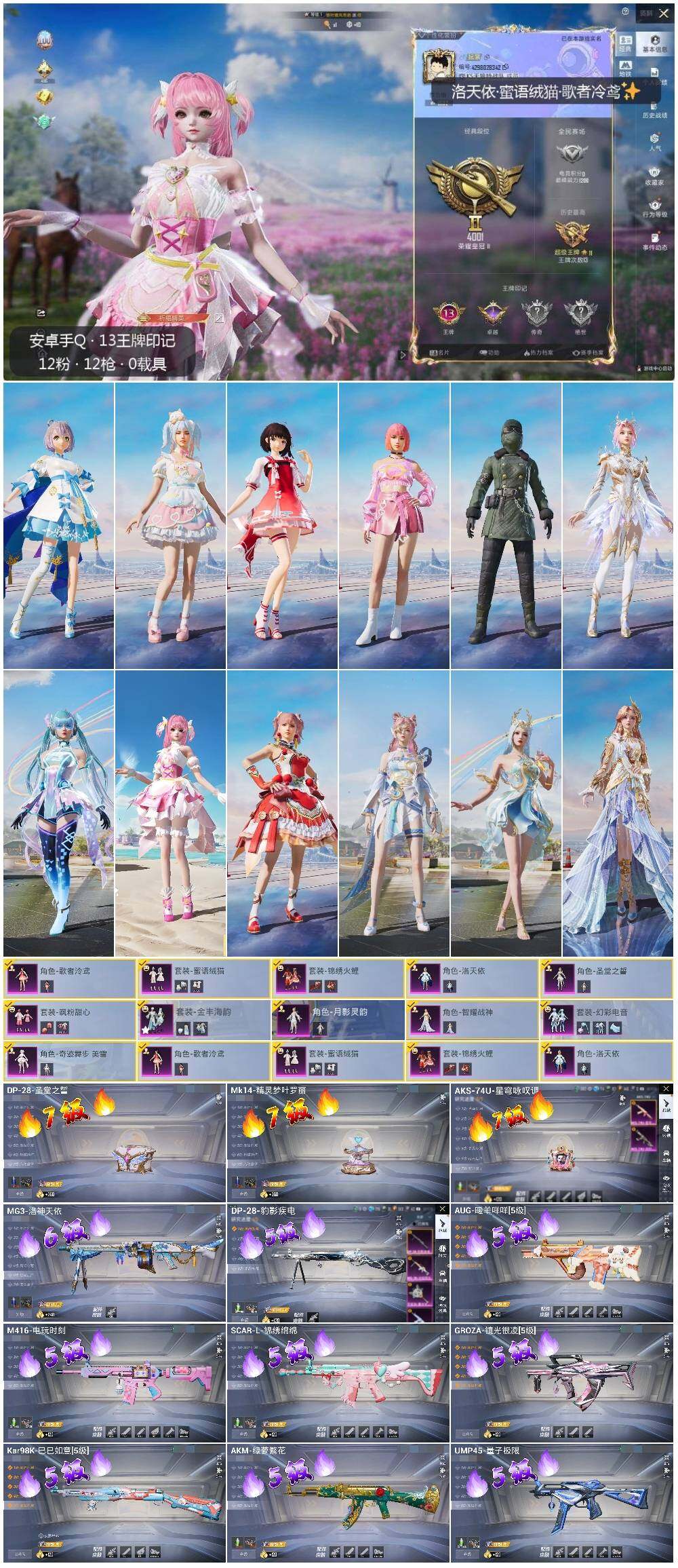 - [13789016]【店主推荐捡漏号!可直接换绑】 安卓 手Q-1粉装-5特效枪-1.4w热力值-1王牌印记-40套装-49枪皮【粉色套装】:角色-冷漠罗丽【粉色枪皮等级】:汤姆逊-热量炸弹(四级),Kar98K-巳巳如意(五级),Mk14-甜梦熊击(四级),MK12-雪月幻音(四级),DP-28-豹影疾电(四级)