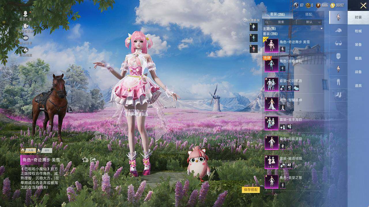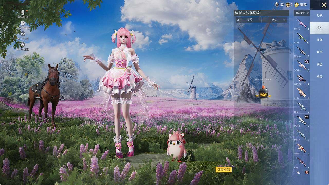 AKM-绿萝繁花,M416-电玩时刻,GROZA-镜光银凌,AUG-暖羊咩咩,UMP45-量子极限,Kar98K-巳巳如意,Mk14-精灵梦叶罗丽,DP-28-圣堂之誓,MG3-洛神天依