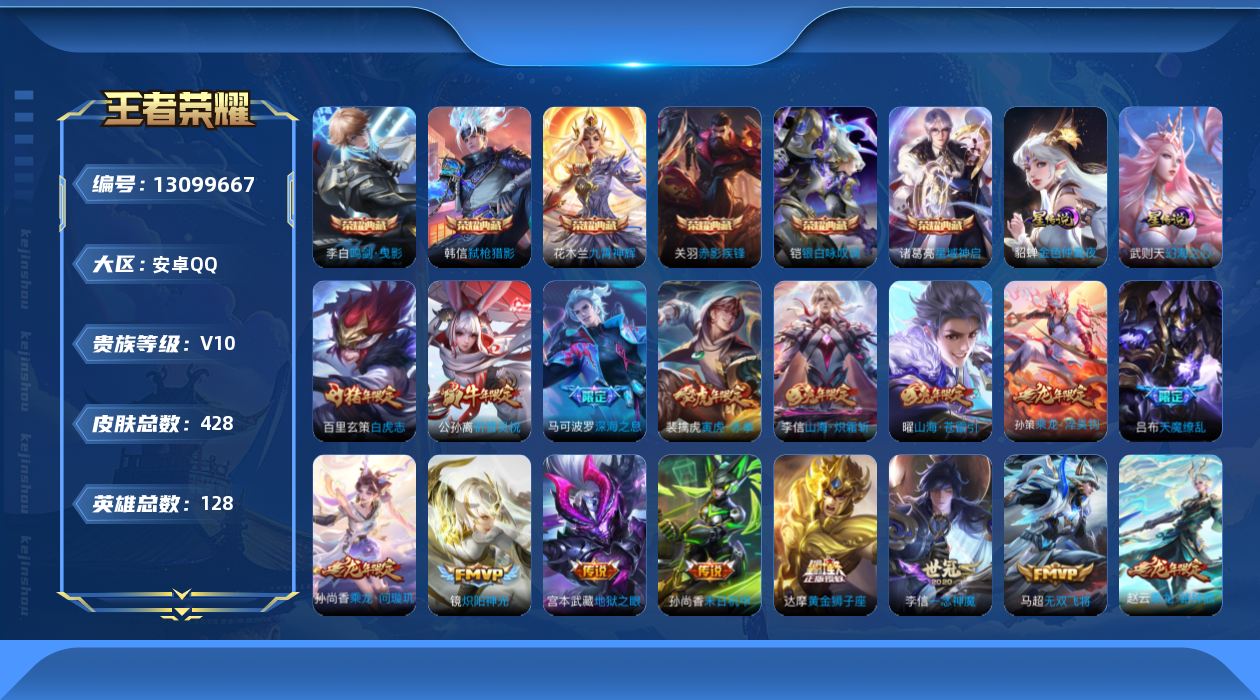[13099667]【特价急出/详情看图】:安卓Q-V10-最强王者段位-128英雄-425皮肤-6典藏-3星元-50传说-130史诗