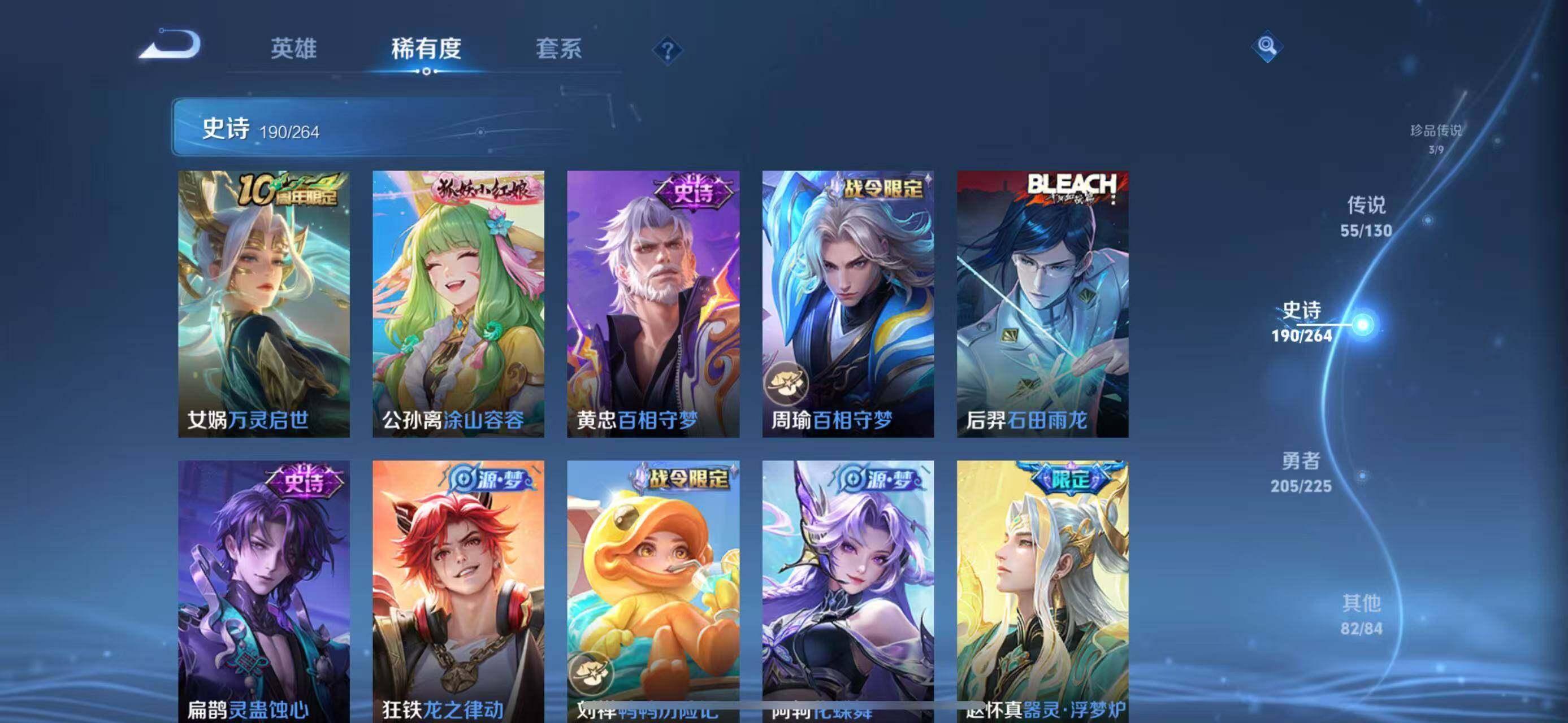 扁鹊炼金王,虞姬凯尔特女王,白起狰,太乙真人饕餮,曹操烛龙,芈月重明,典韦穷奇,狂铁御狮,米莱狄御霄,牛魔御旌,盾山御銮,夏侯惇朔风刀,明世隐疑决卦,老夫子醍醐杖,鬼谷子原初探秘者,狄仁杰万华元夜,程咬金演武夺筹,钟馗驱傩正仪,苏烈千军破阵,吕布猎兽之王,嬴政白昼王子,女娲朔望之晖,典韦蓝屏警告,钟馗神迹守卫,鲁班七号狮舞东方,沈梦溪星空之诺,李元芳银河之约,刘邦夺宝奇兵,马可波罗暗影游猎,蒙犽狂想玩偶喵,元歌云间偶戏,弈星混沌棋,达摩沙漠行僧,兰陵王金庭之子,沈梦溪大漠名商,李元芳云中旅人,桑启海盐诗旅,裴擒虎擒涛扼浪,鲁班大师探海日志,张良古海寻踪,项羽苍威无极,镜青焰无极