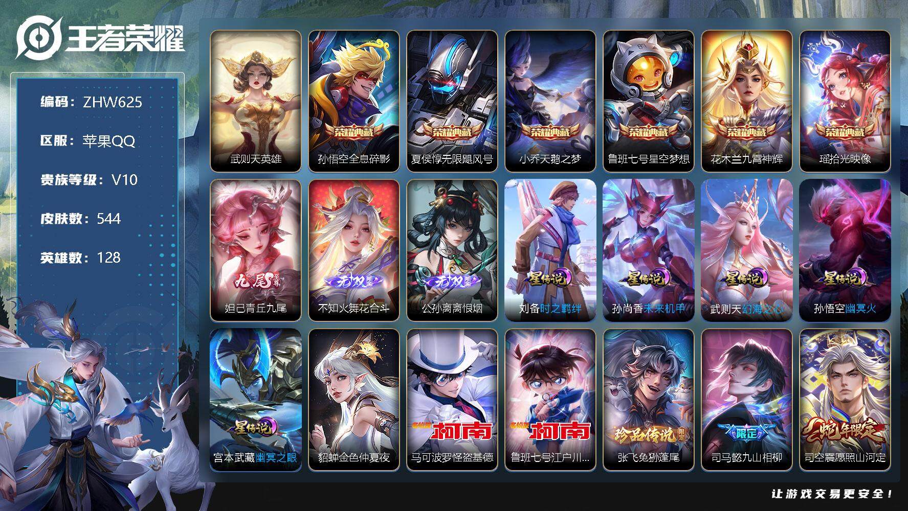 [13100028]苹果Q-V10-最强王者段位-128英雄-544皮肤-6典藏6星传说-3无双-3珍品传说-55传说-190史诗