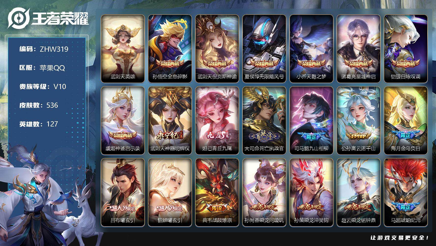 [13100060]发育路30段【特价急出/详情看图】:苹果Q-V10-至尊星耀II段位-127英雄-536皮肤-7典藏-2无双-72传说-180史诗 【荣耀典藏】:武则天英雄,孙悟空全息碎影,武则天倪克斯神谕,夏侯惇无限飓风号,小乔天鹅之梦,诸葛亮星域神启,铠银白咏叹调,虞姬神鉴启示录 【无双皮肤】:武则天神器明辉仪,妲己青丘九尾 【传说皮肤】:大司命死亡执政官,司马懿九山相柳,公孙离云诺千山,海月金乌负日,吕布曦玄引,貂蝉曦玄引,典韦战鼓燎原,孙尚香乘龙问璇玑,孙策乘龙淬吴钩,赵云乘龙铭钟鼎,马超琥珀纪元,铠琥珀纪元,澜逐花归海,艾琳觅芳踪,露娜霜月吟,甄姬至美化雀舞,大乔时之奇旅,鲁班七号时之奇旅,兰陵王影龙天霄,吕布遇见神鼓,宫本武藏惊梅引,云缨鹤归松栖,上官婉儿妄想奇谈,马可波罗妄想实况,诸葛亮鹤羽星尊,亚瑟追逃游戏,安琪拉追逃游戏,张飞百相守梦,夏洛特浮生妄,干将莫邪画中仙,花木兰燃星之曲,虞姬无限倾心,项羽无限倾心,伽罗炽翼辉光,孙悟空齐天大圣,小乔山海琳琅生,曜山海苍雷引,李信山海炽霜斩,李白诗剑行,狄仁杰神器狴犴令,王昭君星穹之声,百里守约碎云,橘右京枫霜尽,娜可露露前尘镜,马可波罗深海之息,后羿无尽星芒,孙策末日机甲,瑶时之祈愿,裴擒虎寅虎赤拳,鲁班七号寅虎瑞焰,孙尚香异界灵契,赵云淬星耀世,王昭君乞巧织情,周瑜音你心动,小乔音你心动,李元芳飞鸢探春,兰陵王默契交锋,公孙离祈雪灵祝,诸葛亮时雨天司,铠绛天战甲,镜炽阳神光,虞姬启明星使,孙悟空零号赤焰,关羽武圣,曜云鹰飞将,貂蝉猫影幻舞,干将莫邪久胜战神,虞姬云霓雀翎,后羿黄金射手座,诸葛亮武陵仙君,孙尚香末日机甲,宫本武藏地狱之眼 【限定皮肤】:白起狰,蒙犽顽岩魄,姜子牙天穹之誓,狄仁杰阴阳师,小乔纯白花嫁,虞姬凯尔特女王,小乔山海琳琅生,赵云皇家上将,赵云龙胆,赵云百木心枪,墨子神迹守卫,墨子降魔,妲己热情桑巴,妲己时之奇旅,嬴政优雅恋人,嬴政白昼王子,孙尚香蔷薇恋人,孙尚香异界灵契,鲁班七号狮舞东方,鲁班七号乒乒小将,鲁班七号寅虎瑞焰,鲁班七号时之奇旅,庄周云端筑梦师,庄周高山流水,高渐离死亡摇滚,高渐离玩趣恶龙,钟无艳王者之锤,钟无艳超时空战士,孙膑天狼运算者,扁鹊奇幻香踪,白起夜都怪侠,芈月重明,芈月白晶晶,芈月幻夜卜梦,吕布猎兽之王,吕布御风骁将,吕布遇见神鼓,周瑜真爱至上,周瑜赤莲之焰,元歌云间偶戏,