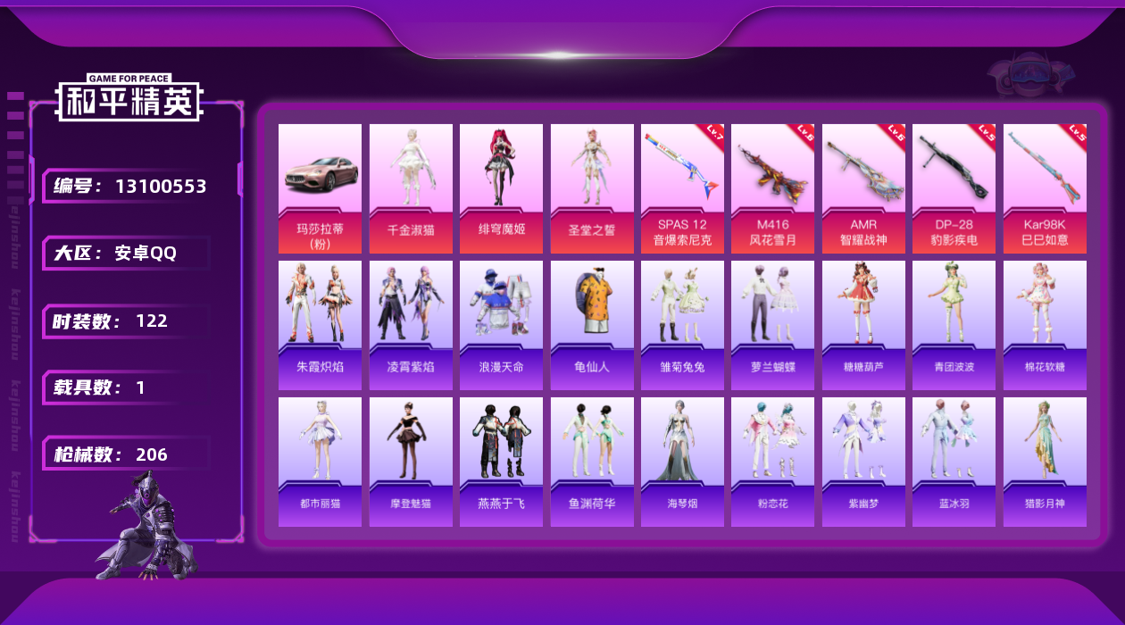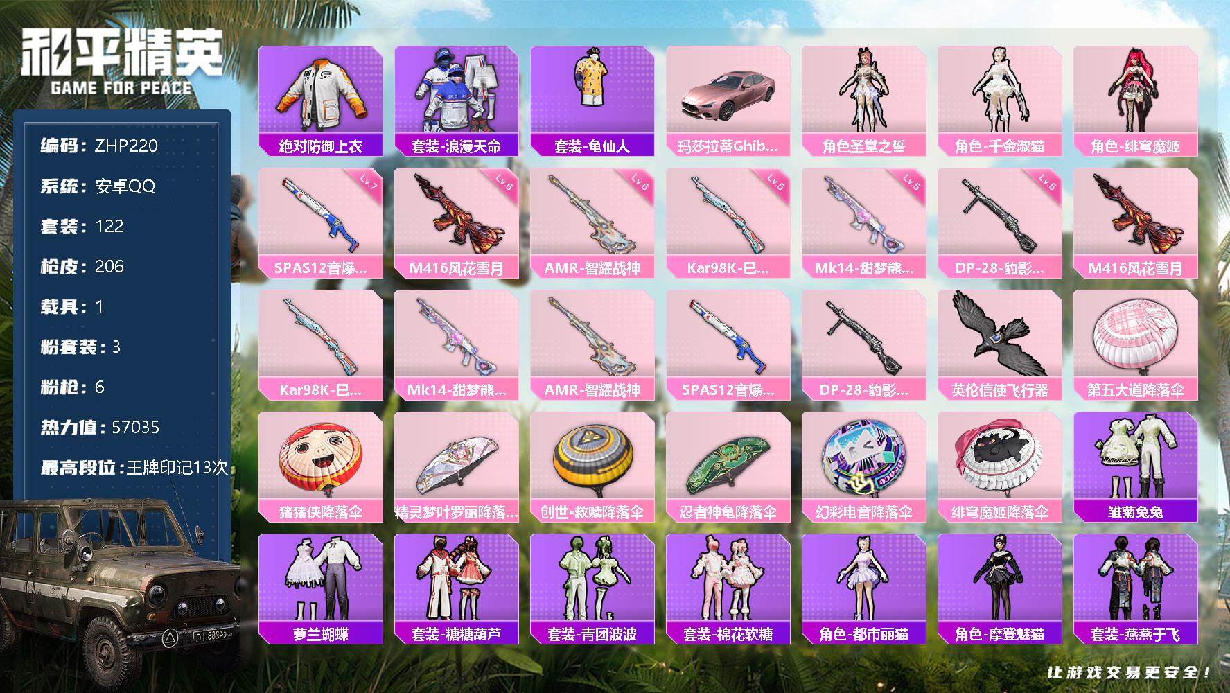 [13100553]地铁满天赋【特价急出/详情看图】:安卓 手Q-3粉装-6特效枪-1载具-1粉色飞行器-5.7w热力值-13王牌印记-122套装-206枪皮【热门品类】:绝对防御上衣,套装-浪漫天命,套装-龟仙人【粉色载具】:玛莎拉蒂Ghibli(粉)【粉色套装】:角色-圣堂之誓,角色-千金淑猫,角色-绯穹魔姬【粉色枪皮等级】:M416-风花雪月(六级),Kar98K-巳巳如意(五级),Mk14-甜梦熊击(五级),AMR-智耀战神(六级),SPAS-12-音爆索尼克(七级),DP-28-豹影疾电(五级)【粉色飞行器】:英伦信使飞行器