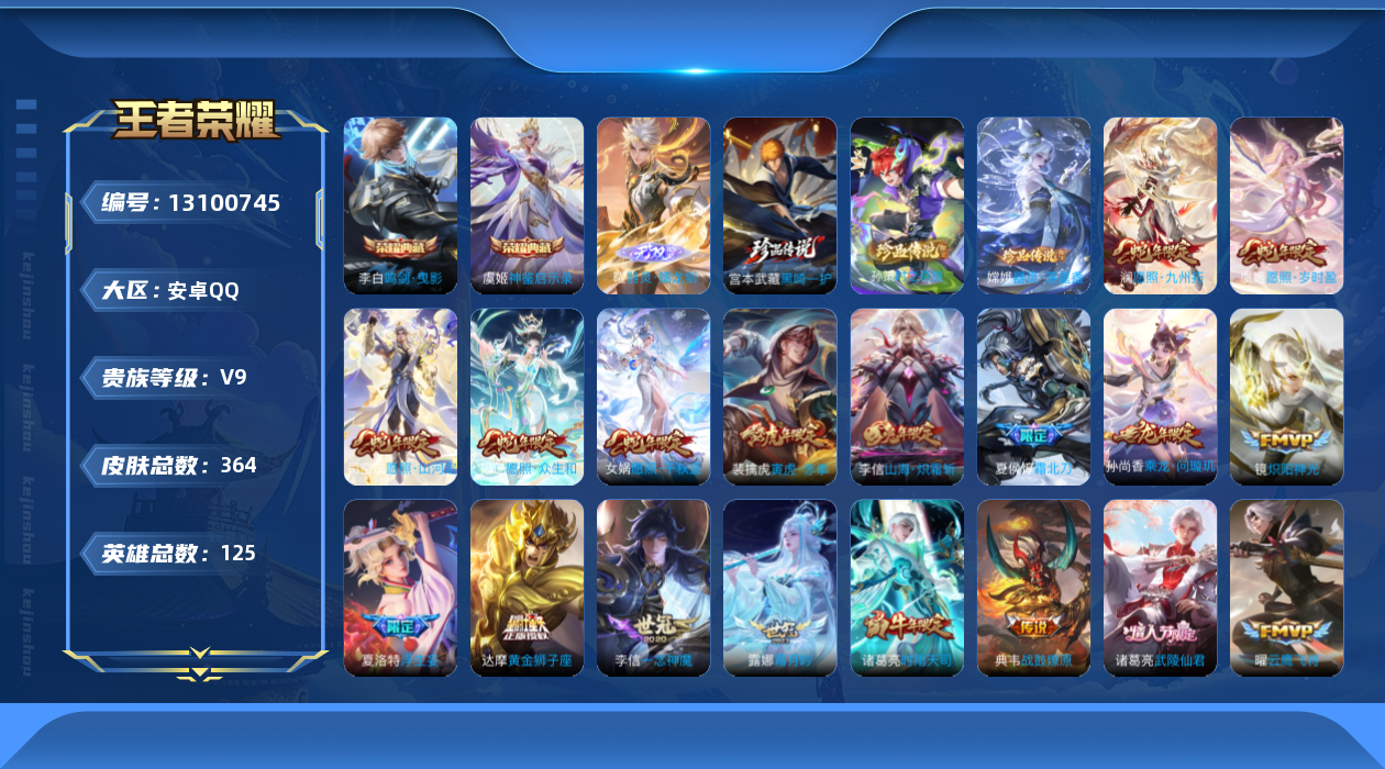 [13100745]安卓Q-V7-至尊星耀IV段位-125英雄-364皮肤-2典藏-0珍品无双-1无双-3珍品传说-32传说-127史诗