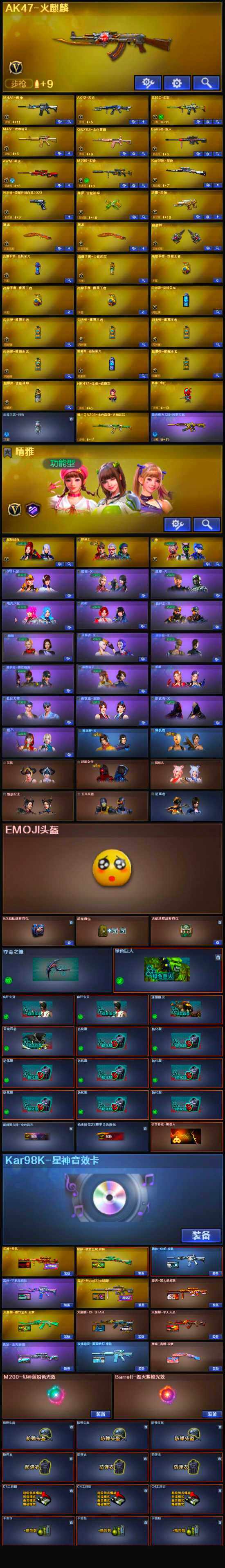 - [12617451]四川一区-68V-7王者-3炫金 【热门武器】:QBZ03-金色蔷薇,HK417-朱雀,M200-幻神,死亡之眼,M4A1-黑骑士,汤姆逊-烈龙*7,RPK-盘龙*3,沙鹰-修罗*6 【王者炫金武器】:炫金火麒麟,炫金毁灭,炫金修罗,王者之幻,王者之魂 【音效卡】:M200-幻神音效卡,AK47-火麒麟音效卡,M4A1-黑骑士音效卡,Barrett-毁灭音效卡 【稀有皮肤】:幻神-周瑜皮肤,雷神-能量核心*2,雷神-星空,火麒麟-AG战队皮肤,火麒麟-百城,毁灭-暗月,毁灭-黑大圣皮肤,天龙-秘银,天龙-能量核心,AWM-天龙-传奇白鲨,天神-暗月,屠龙-荣耀之锋 【角色】:王者-葵-貂蝉,王者之瞳,王者春,零-水下丽影,零,葵,蜀雪,青霞仙子 【人偶武器】:闪光弹-貂蝉,高爆手雷-大乔 【暴走生化】:死亡之眼,超级对讲机 【英雄级武器】:马来剑-夜魔,斩神刀-雷暴,M4A1-武圣,QBZ03-金色蔷薇,HK417-朱雀,M4A1-雷神*3,M4A1-黑龙,M4A1-玫瑰精灵,M4A1-黑骑士,M4A1-死神,RPK-盘龙*3,汤姆逊-烈龙*7,AK47-无影*2,AK47-火麒麟*2,AK47-黑武士,AK12-天启,AWM-天龙,Barrett-毁灭*3,Barrett-极光,AK47-机械迷城,AA-12-雷霆,M200-幻神,AK47-黑鲨,AK-47-猩红传说,AK47-B-战神,AK47-B-常胜将军,沙鹰-天神*2,沙鹰-修罗*6,麒麟刺,擎天*3,龙啸,屠龙*3 【特殊枪械】:1黑骑士,6烈龙,3盘龙