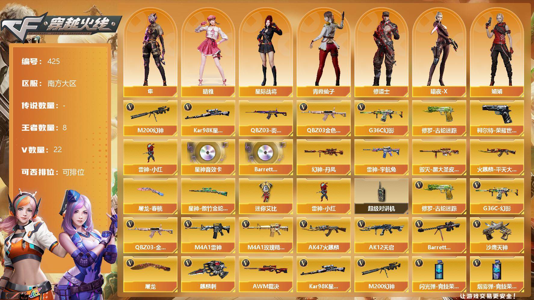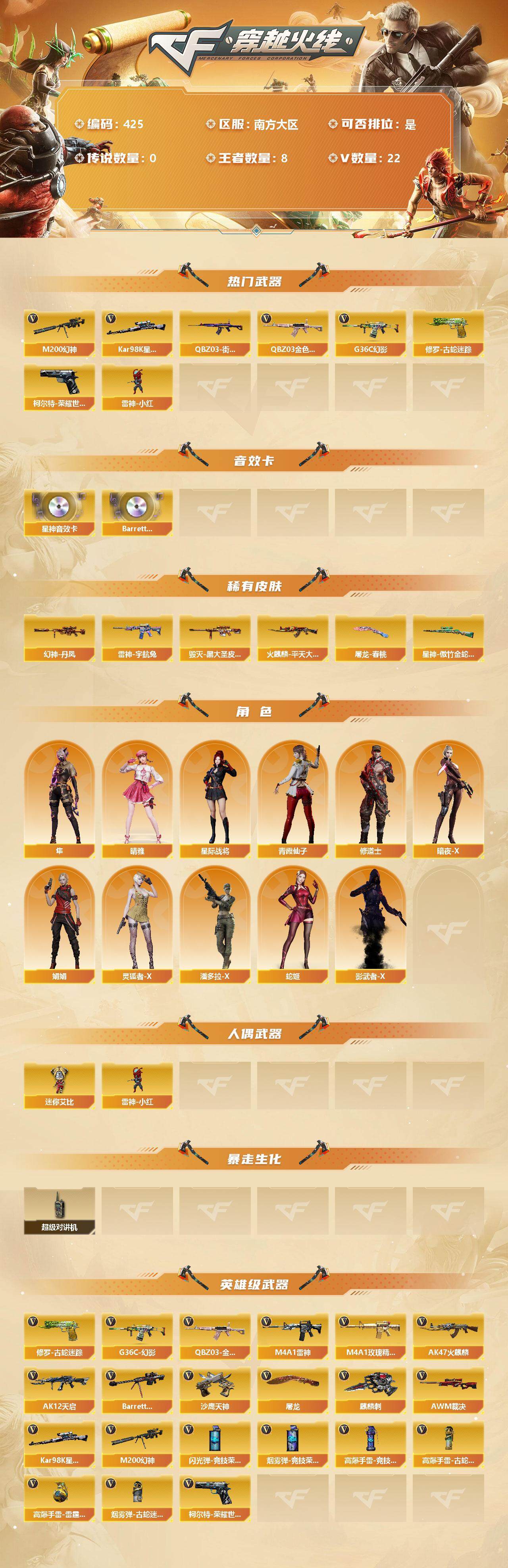 [13100835]【425】19V/91级/将帅/8王者/3英雄/G36C-幻影/QBZ03-金色蔷薇/M200-幻神/柯尔特-荣耀世冠白鲨2023/修罗-古蛇迷踪/QBZ03-街机/Kar98k-星神/雷神-小红/星神音效卡/Barrett-碧霄极光音效卡/幻神丹凤/裁决-流光秘银/星神-傲竹金蛇/雷神-宇航兔/雷神-化蛇 皮肤/火麒麟-平天大圣/火麒麟-傲竹金蛇 皮肤/毁灭-黑大圣皮肤/玫瑰精灵-蓝调梦幻 皮肤/屠龙-春桃/晴雅/隼/星际战将/修道士/暗夜-X/娟娟/灵狐者-X/潘多拉-X/青霞仙子/蛇姬/影武者-X/迷你艾比/超级对讲机/AK47-火麒麟/M4A1-雷神/AK12-天启/M4A1-玫瑰精灵/Barrett-毁灭/AWM-裁决/沙鹰-天神/屠龙/麒麟刺/高爆手雷-竞技荣光/高爆手雷-古蛇迷踪/高爆手雷-雷霆王者/闪光弹-竞技荣光/烟雾弹-竞技荣光/烟雾弹-古蛇迷踪/Barrett-碧霄极光