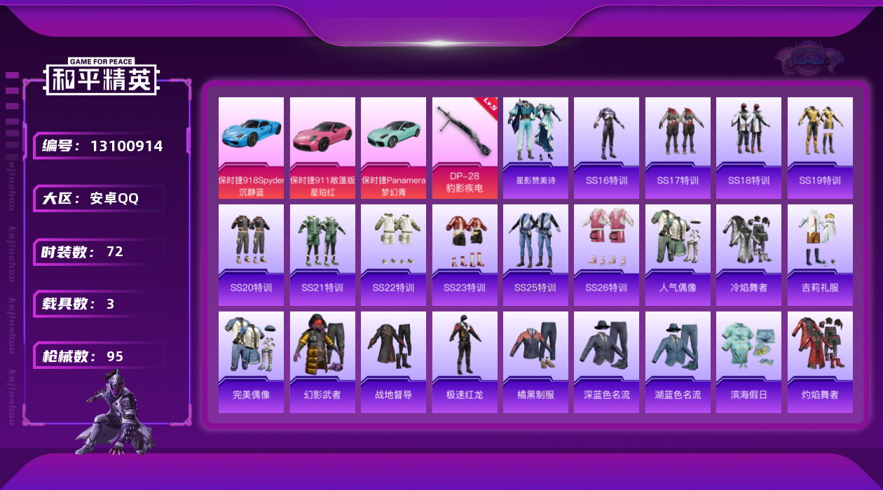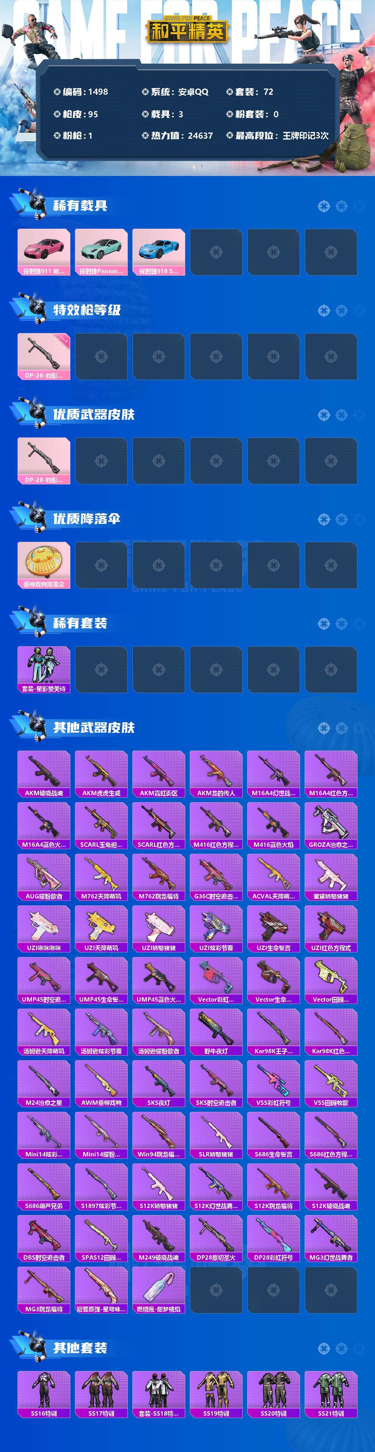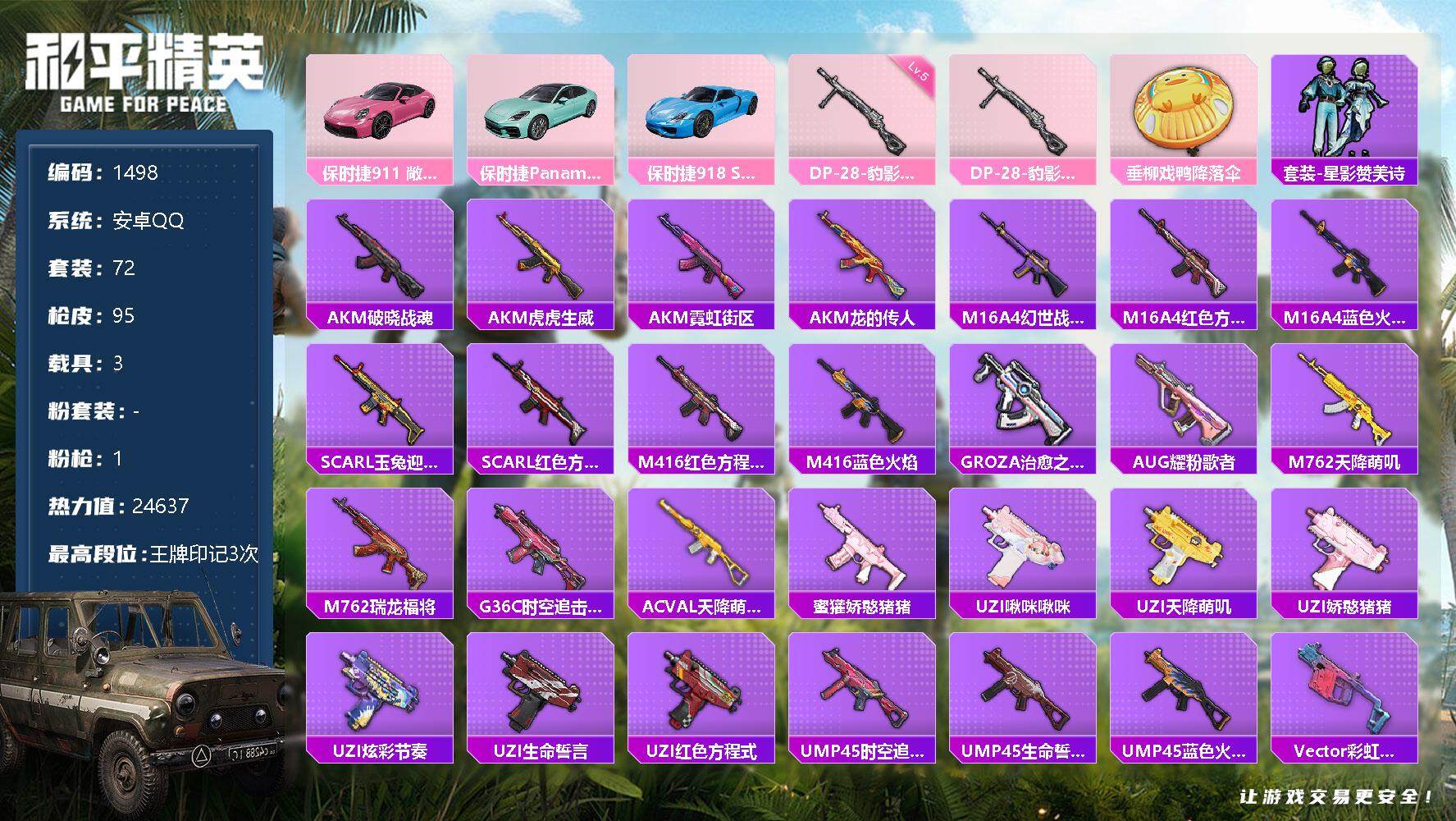 [13100914]安卓 手Q-0粉装-1特效枪-3载具-0粉色飞行器-24637热力值-3王牌印记-72套装-95枪皮 【粉色载具】:保时捷911 敞篷版(星珀红),保时捷Panamera(梦幻青),保时捷918 Spyder(沉静蓝) 【粉色枪皮等级】:DP-28-豹影疾电(五级) 【粉色枪皮】:DP-28-豹影疾电 【粉色降落伞】:垂柳戏鸭降落伞 【稀有套装】:套装-星影赞美诗 【稀有枪皮】:AKM-破晓战魂,AKM-虎虎生威,AKM-霓虹街区,AKM-龙的传人,M16A4-幻世战舞者,M16A4-红色方程式,M16A4-蓝色火焰,SCAR-L-玉兔迎春,SCAR-L-红色方程式,M416-红色方程式,M416-蓝色火焰,GROZA-治愈之星,AUG-耀粉歌者,M762-天降萌叽,M762-瑞龙福将,G36C-时空追击者,AC-VAL-天降萌叽,蜜獾-娇憨猪猪,UZI-啾咪啾咪,UZI-天降萌叽,UZI-娇憨猪猪,UZI-炫彩节奏,UZI-生命誓言,UZI-红色方程式,UMP45-时空追击者,UMP45-生命誓言,UMP45-蓝色火焰,Vector-彩虹符号,Vector-生命誓言,Vector-田园牧歌,汤姆逊-天降萌叽,汤姆逊-炫彩节奏,汤姆逊-耀粉歌者,野牛-夜灯,Kar98K-王子的夏天,Kar98K-红色方程式,M24-治愈之星,AWM-垂柳戏鸭,SKS-夜灯,SKS-时空追击者,VSS-彩虹符号,VSS-田园牧歌,Mini14-炫彩节奏,Mini14-耀粉歌者,Win94-瑞龙福将,SLR-娇憨猪猪,S686-生命誓言,S686-红色方程式,S686-葫芦兄弟,S1897-炫彩节奏,S12K-瑞龙福将,S12K-破晓战魂,S12K-娇憨猪猪,S12K-幻世战舞者,DBS-时空追击者,SPAS-12-田园牧歌,M249-破晓战魂,DP-28-原初圣火,DP-28-彩虹符号,MG3-幻世战舞者,MG3-瑞龙福将,短管霰弹-星穹咏叹调,燃烧瓶-甜梦桃焰 【其他套装】:套装-SS16特训,套装-SS17特训,套装-SS18特训,套装-SS19特训,套装-SS20特训,套装-SS21特训,套装-SS22特训,套装-SS23特训,套装-SS25特训,套装-SS26特训,套装-人气偶像,套装-冷焰舞者,套装-吉莉礼服,套装-完美偶像,套装-幻影武者,套装-战地督导,套装-极速红龙