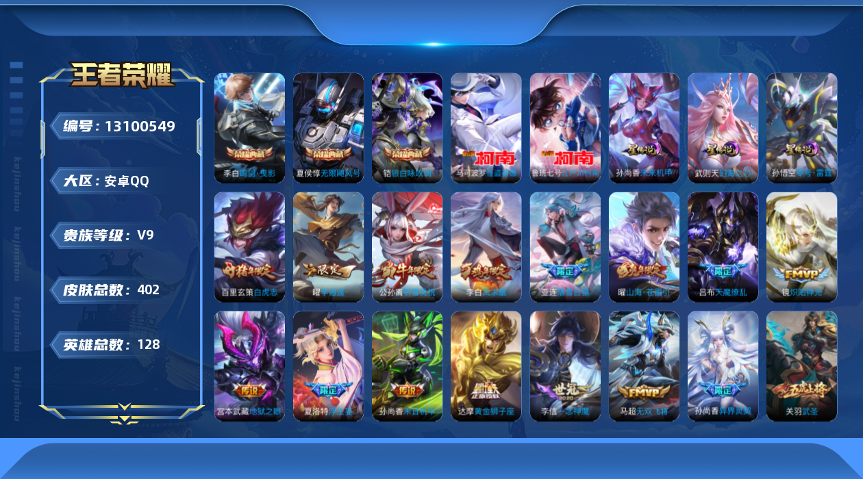 [13100549]安卓Q-V9-最强王者段位-128英雄-402皮肤-3典藏3星传说-2珍品传说-30传说-116史诗 【英雄全皮】:刘禅全皮,孙权全皮,太乙真人全皮,鬼谷子全皮,猪八戒全皮,蒙恬全皮,夏洛特全皮,空空儿全皮,影全皮 【荣耀典藏】:武则天英雄,夏侯惇无限飓风号,李白鸣剑曳影,铠银白咏叹调 【珍品传说】:马可波罗怪盗基德,鲁班七号江户川柯南 【传说皮肤】:云缨幻光神枪,桑启鸣野蒿,亚连落雪白狼,马可波罗妄想实况,亚瑟追逃游戏,夏洛特浮生妄,曜山海苍雷引,李白诗剑行,马超无双飞将,孙策末日机甲,孙尚香异界灵契,曜李逍遥 ,公孙离祈雪灵祝,镜炽阳神光,虞姬启明星使,孙悟空零号赤焰,关羽武圣,李信一念神魔,干将莫邪久胜战神,虞姬云霓雀翎,达摩黄金狮子座,百里玄策白虎志,花木兰冠军飞将,李白凤求凰,孙尚香末日机甲,宫本武藏地狱之眼,孙悟空地狱火,吕布天魔缭乱,武则天海洋之心,狄仁杰超时空战士 【限定皮肤】:白起狰,姜子牙天穹之誓,杨戬破阵退雄兵,狄仁杰阴阳师,虞姬凯尔特女王,赵云皇家上将,赵云龙胆,妲己时之彼端,嬴政优雅恋人,嬴政白昼王子,孙尚香异界灵契,鲁班七号狮舞东方,庄周蜃楼王,庄周高山流水,高渐离死亡摇滚,钟无艳王者之锤,钟无艳超时空战士,孙膑妖精王,扁鹊炼金王,白起夜都怪侠,芈月重明,吕布天魔缭乱,吕布猎兽之王,元歌无心,夏侯惇朔风刀,甄姬游园惊梦,甄姬落雪兰心,曹操烛龙,典韦穷奇,马可波罗逐梦之星,马可波罗暗影游猎,马可波罗山海玄木吟,马可波罗妄想实况,狄仁杰魔术师,狄仁杰万华元夜,达摩沙漠行僧,项羽海滩派对,项羽霸王别姬,老夫子醍醐杖,关羽冰锋战神,关羽武圣,貂蝉逐梦之音,程咬金演武夺筹,韩信逐梦之影,王昭君午后时光,兰陵王金庭之子,花木兰青春决赛季,花木兰瑞麟志,亚瑟狮心王,亚瑟追逃游戏,孙悟空至尊宝,孙悟空零号赤焰,牛魔御旌,李元芳银河之约,李元芳云中旅人,虞姬霸王别姬,虞姬启明星使,钟馗神迹守卫,钟馗驱傩正仪,杨玉环遇见飞天,女娲朔望之晖,干将莫邪冰霜恋舞曲,干将莫邪胡桃夹子,雅典娜黎明之约,蔡文姬繁星吟游,太乙真人饕餮,太乙真人华丽摇滚,鬼谷子原初探秘者,鬼谷子五谷丰年,苏烈玄武志,苏烈千军破阵,百里玄策白虎志,百里玄策原初追逐者,百里守约朱雀志,弈星混沌棋,梦奇顽趣,梦奇天降福星,公孙离祈雪灵祝,沈梦溪星空之诺,沈梦溪大漠名商,明世隐疑决卦,明世隐吟游