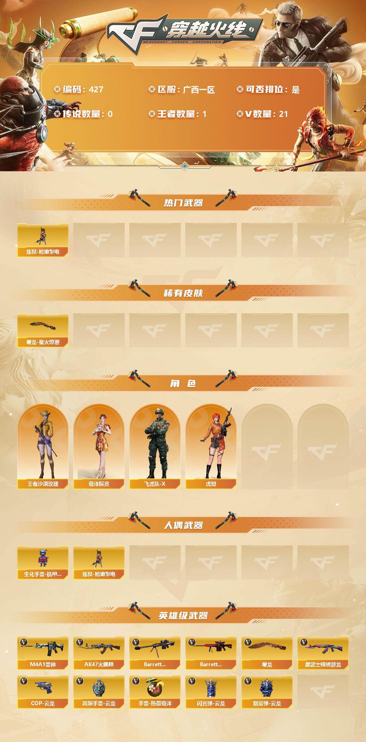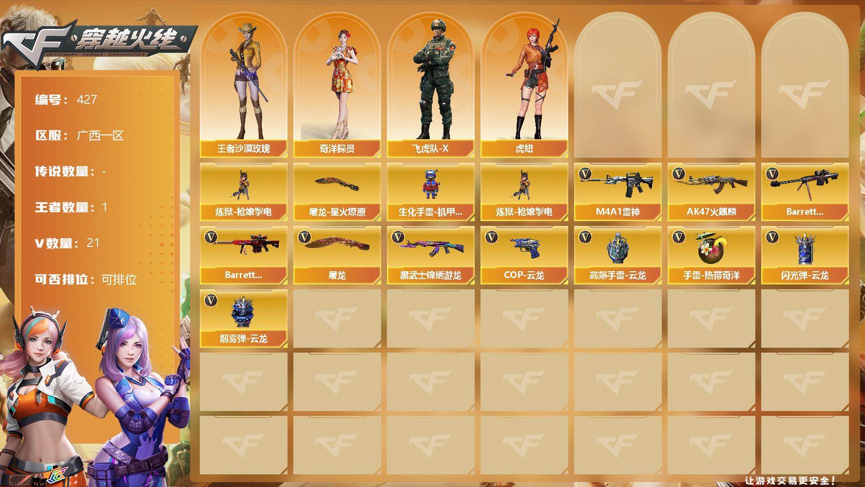 [13100962]【427】21V/100级/元帅/1王者/炼狱-枪娘掣电/屠龙-星火燎原/王者-沙漠玫瑰/奇洋探员/飞虎队-X/虎妞/生化手雷-机甲核心/AK47-火麒麟/M4A1-雷神/AK47-黑武士-锦绣游龙/Barrett-毁灭/Barrett-极光/COP357-云龙/屠龙/高爆手雷-云龙/手雷-热带奇洋/闪光弹-云龙/烟雾弹-云龙