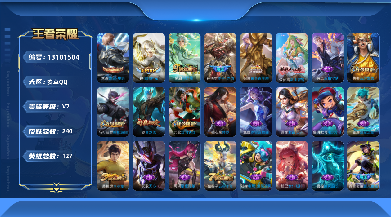 - [12165142]V7 1典藏 1珍品传说 9传说 125英雄 267皮肤 可修改实名 优质装备:九霄神辉(木兰典藏),江户川柯南,黄金射手座,云鹰飞将(小将军),零号·赤焰,无双飞将,山海·炽霜斩(李信年限),涂山容容 传说皮:幻光神枪 珍宝阁皮:万物之道,优雅恋人,女武神 限定皮:愿照·岁时盈(虞姬年限),愿照·千秋盛(女娲年限),逐霄战戟,陌上桑,鸣野蒿,高山流水,五谷丰年,梁祝,孙行者 史诗皮:鸭鸭历险记-刘禅,器灵·浮梦炉,化蝶舞,星界战将,谪仙醉月,龙之律动,石田雨龙,茶境仙,怒海争锋,炽弈燎原,破空之剑,战舞者,芈月浮光幕影,琥珀纪元伽罗,蔬乡物语(鲁班七号),百相守梦-百里守约,星界特工,百相守梦-黄忠,紫霞仙子,电玩小子(小书包),黄金分割率,特工魅影,魅语,百解令(蒙犽),高渐离燃音魔法,蒙恬荣光圣徽,偶像歌手,电玩·爆裂旋风,末日机甲-吕布,猫狗日记-孙策,猫狗日记-大乔,乱世虎臣,节奏热浪,修罗,女仆咖啡,水果甜心,天才门将,星夜王子,心灵骇客,功夫厨神,德古拉伯爵,暗隐猎兽者,幽灵船长,鬼剑武藏,心灵战警,天秀·启明,舞动绿茵,地狱岩魂,纤云弄巧,拒霜思,缤纷独角兽,乘风破浪,逐浪之夏,水晶猎龙者,曙光守护者,金属风暴,原初追逐者,圣诞狂欢,圣诞恋歌,鹰眼统帅,暗夜贵公子,魅力维加斯,黎明之约,赏金猎手,无心,未来纪元-赵云
